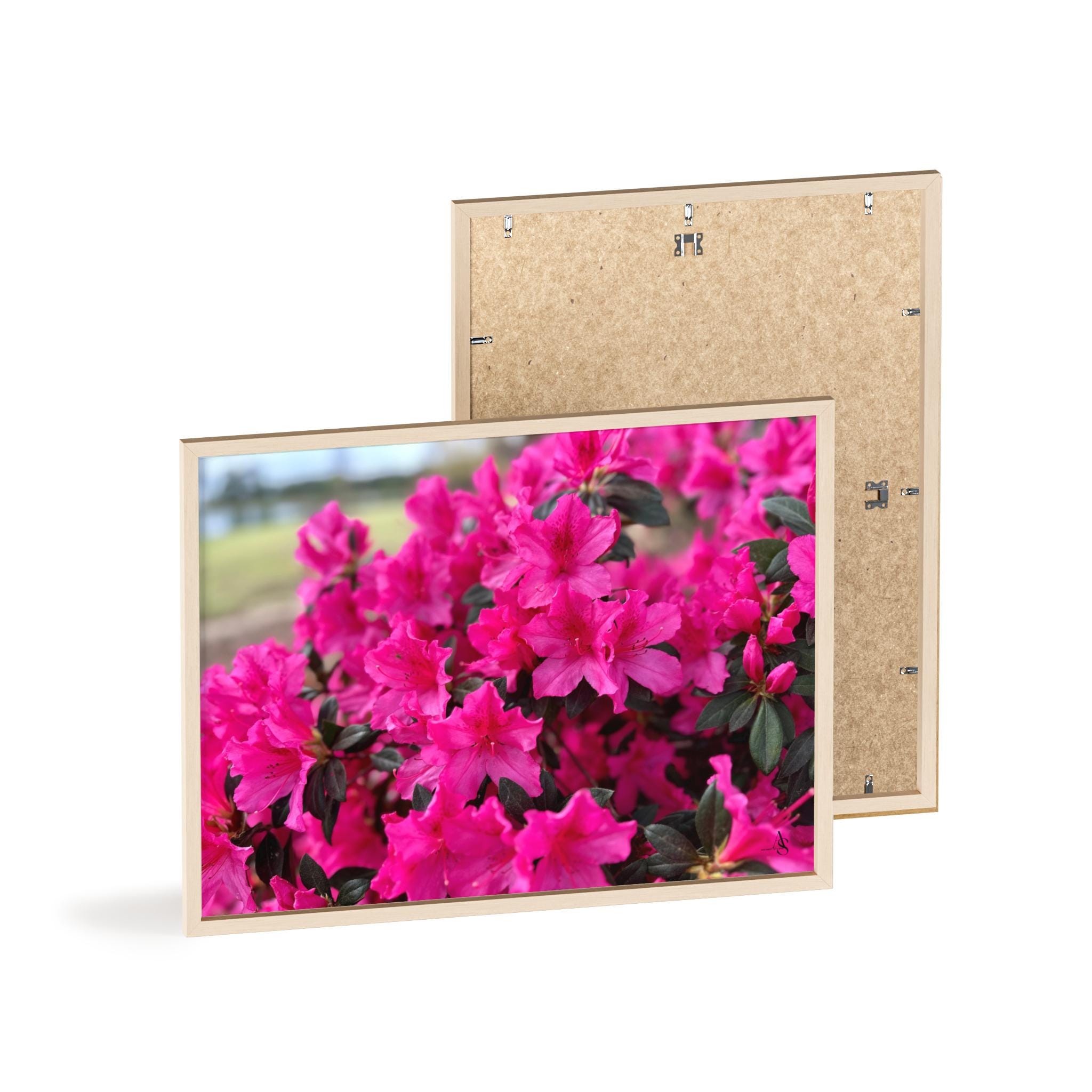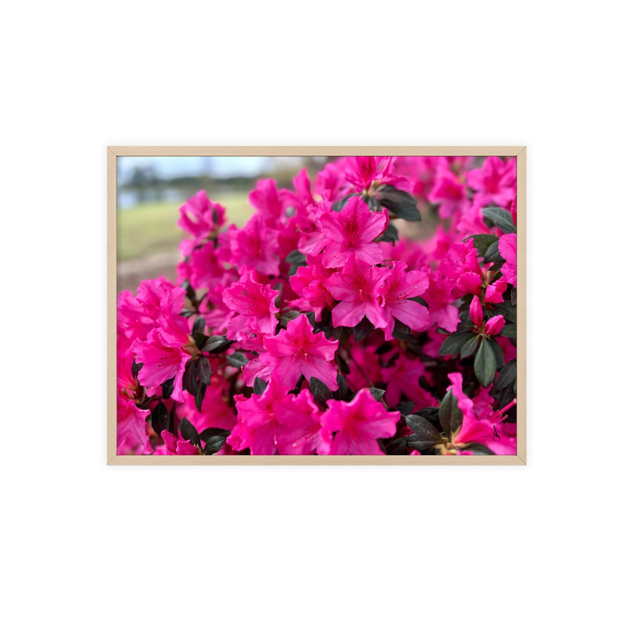 Soft petals blush across the paper—delicate pink azaleas blooming in gentle clusters. This framed poster brings a quiet, floral moment to a room: sunlight on a windowsill, a cup of tea, and the calm of a slow afternoon. Hung in a cozy reading nook or layered on a gallery wall, the artwork feels both fresh and familiar, a touch of spring that brightens wood tones and neutral palettes alike. The slim pine frame and protective acrylic glass keep the image crisp while the satin or matte finish adds a subtle, tactile quality that suits thoughtful interiors and floral lovers who appreciate simple, natural beauty.