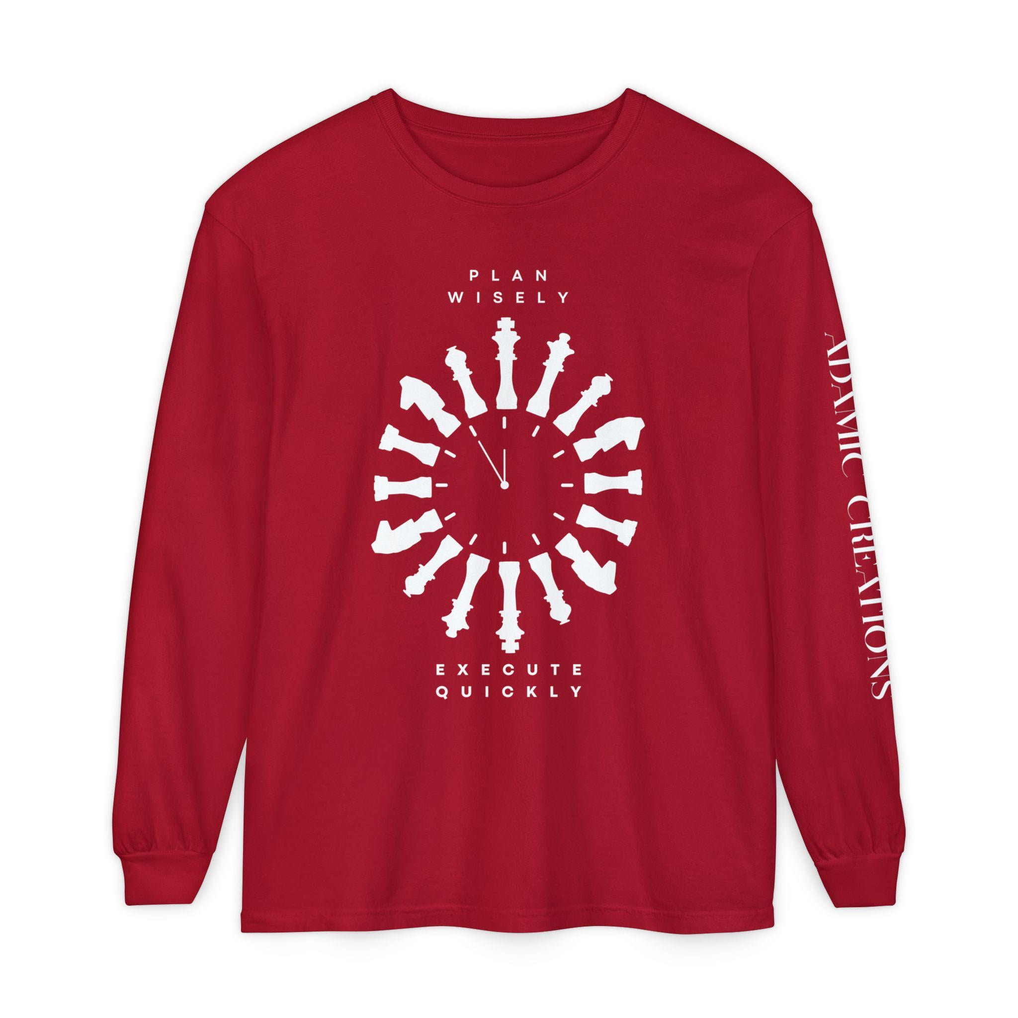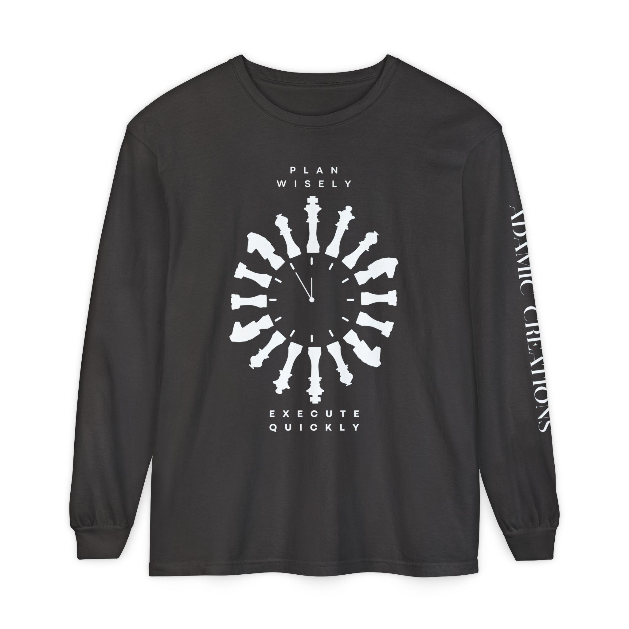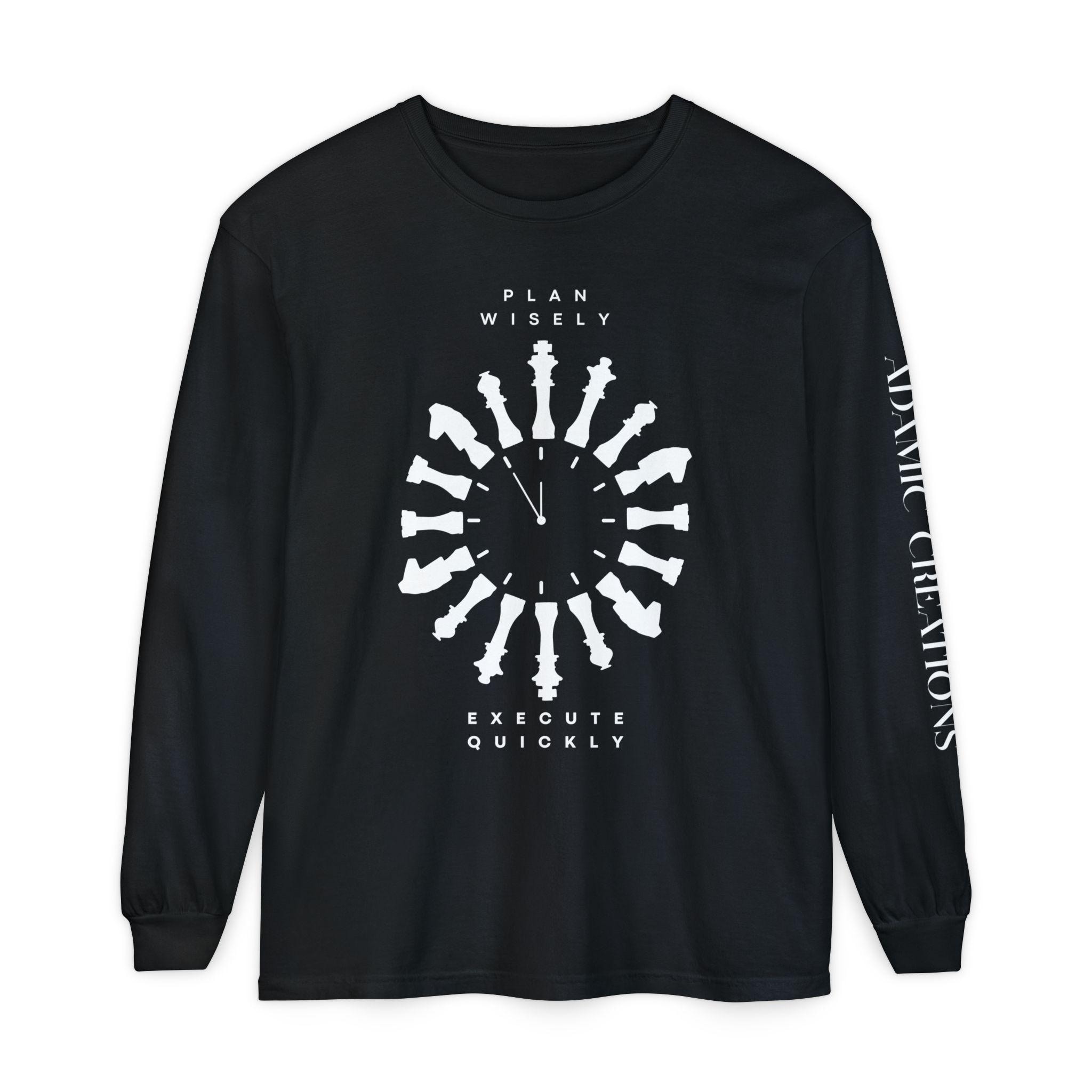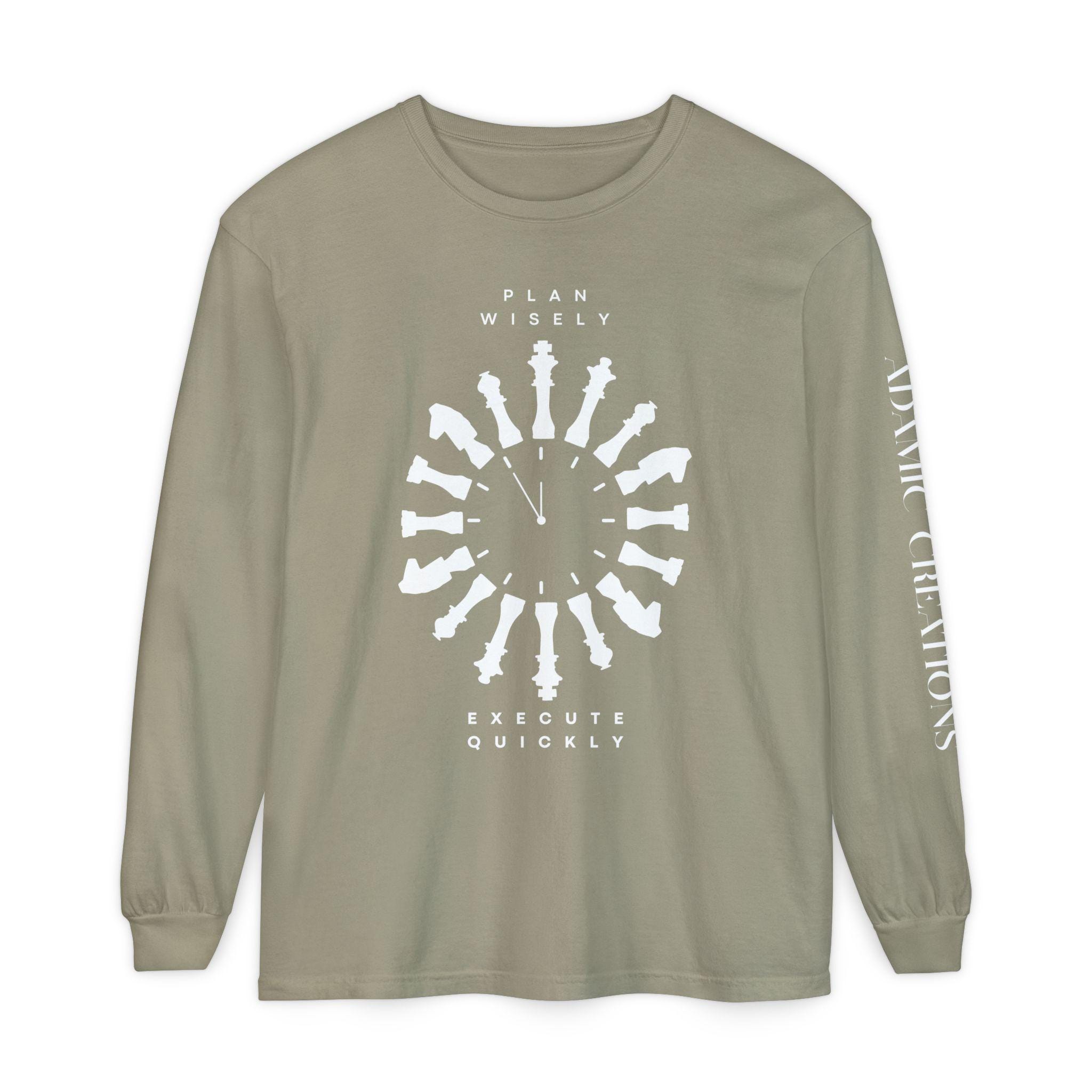 This long-sleeve tee whispers restraint and thoughtful action. Soft, garment-dyed cotton carries a small, confident message: “plan wisely.” It sits comfortably in quiet mornings at a desk or layered under a jacket for late-night strategy sessions. The fabric’s lived-in color and smooth ring-spun feel invite repeated wear without shouting for attention. Subtle details — ribbed cuffs, reinforced neck and shoulders, and durable double-stitched hems — keep the silhouette steady as you move through meetings, travel, or sketching out your next steps. Wear it when you need a calm reminder to think ahead, map out decisions, or slow down and choose well.