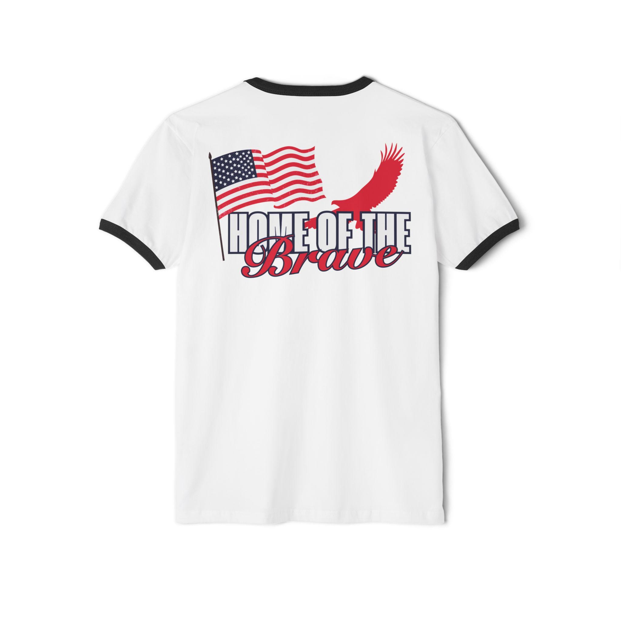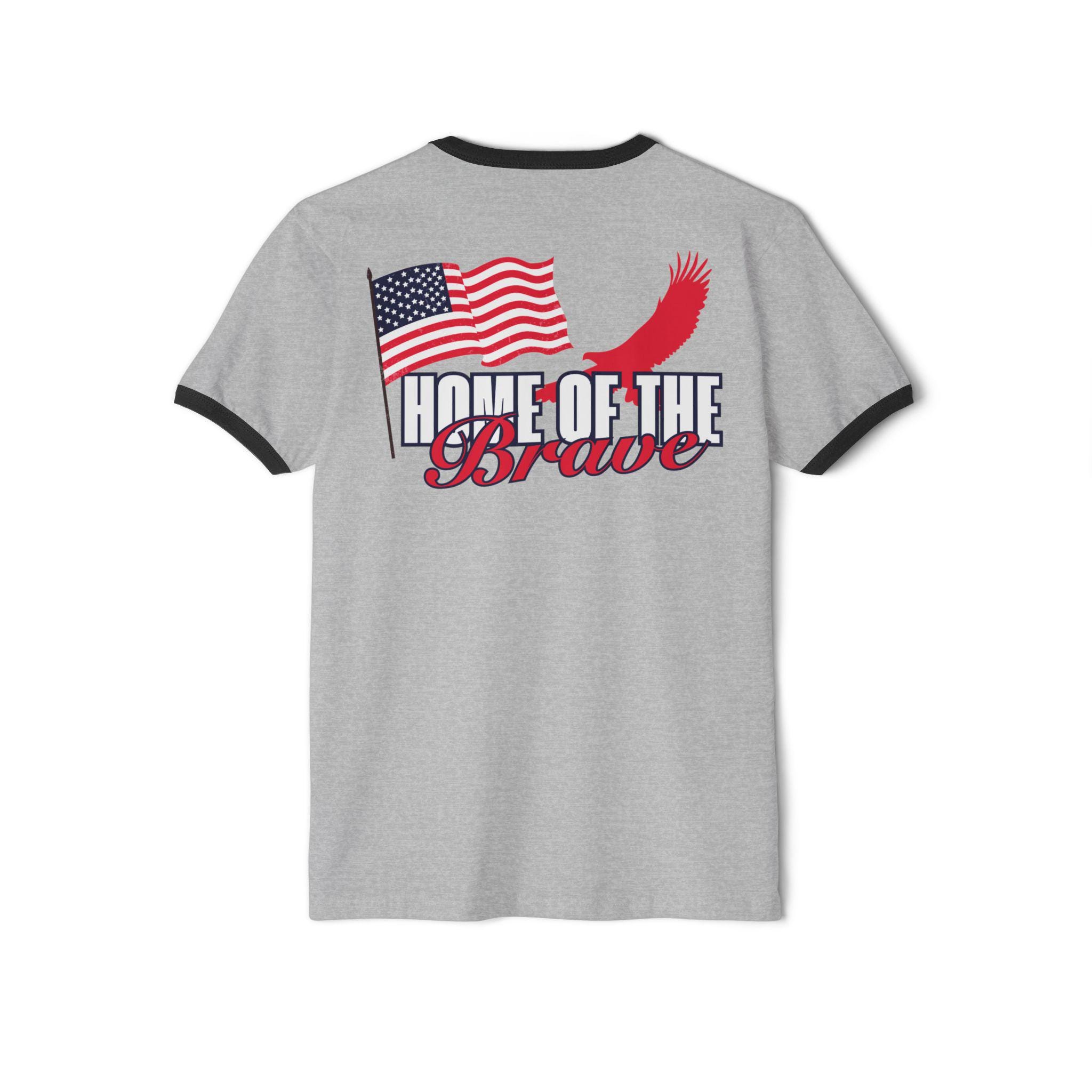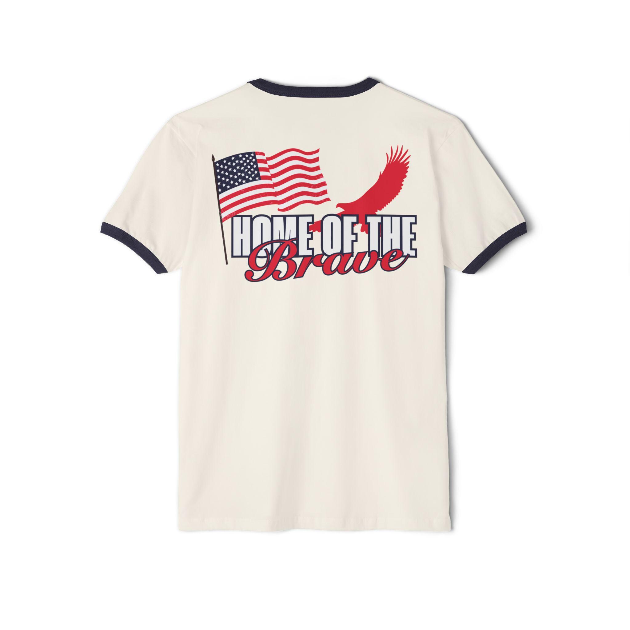A patriotic Unisex Cotton Ringer Tee perfect for celebrating the 4th of July, featuring 'Home Of The Brave' design. The light fabric and classic fit make it comfortable for all-day wear. Suitable for those who love to show their American pride and celebrate Independence Day.