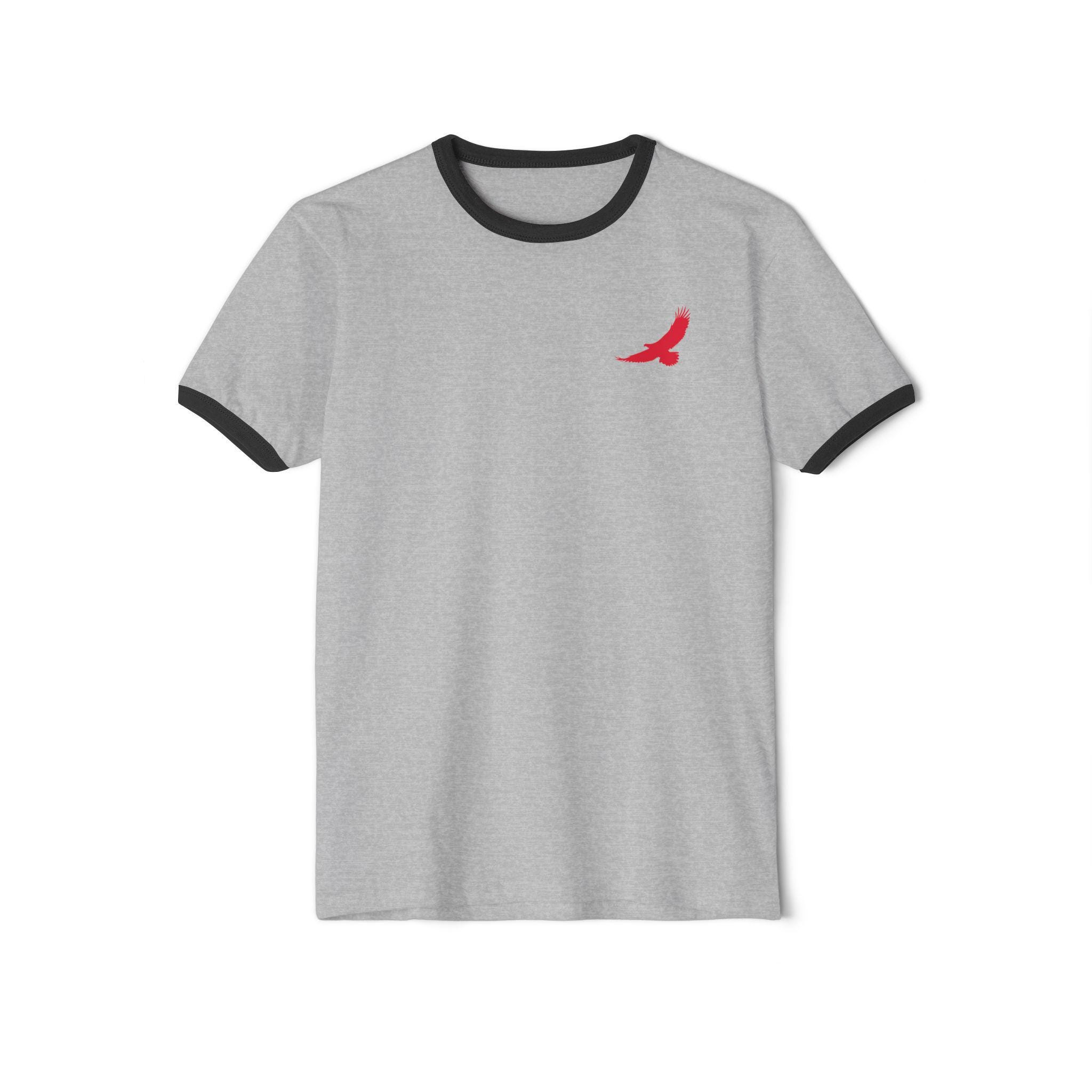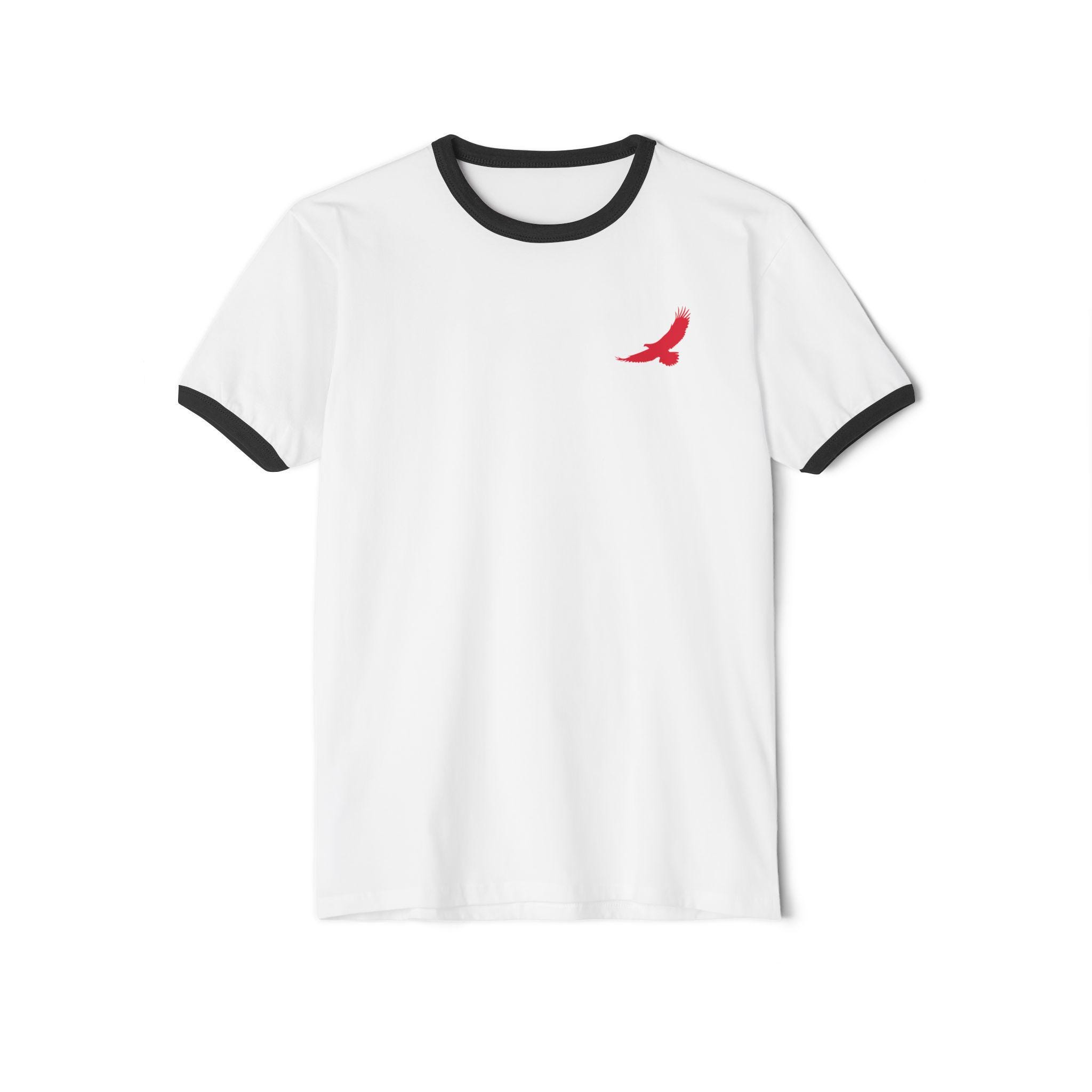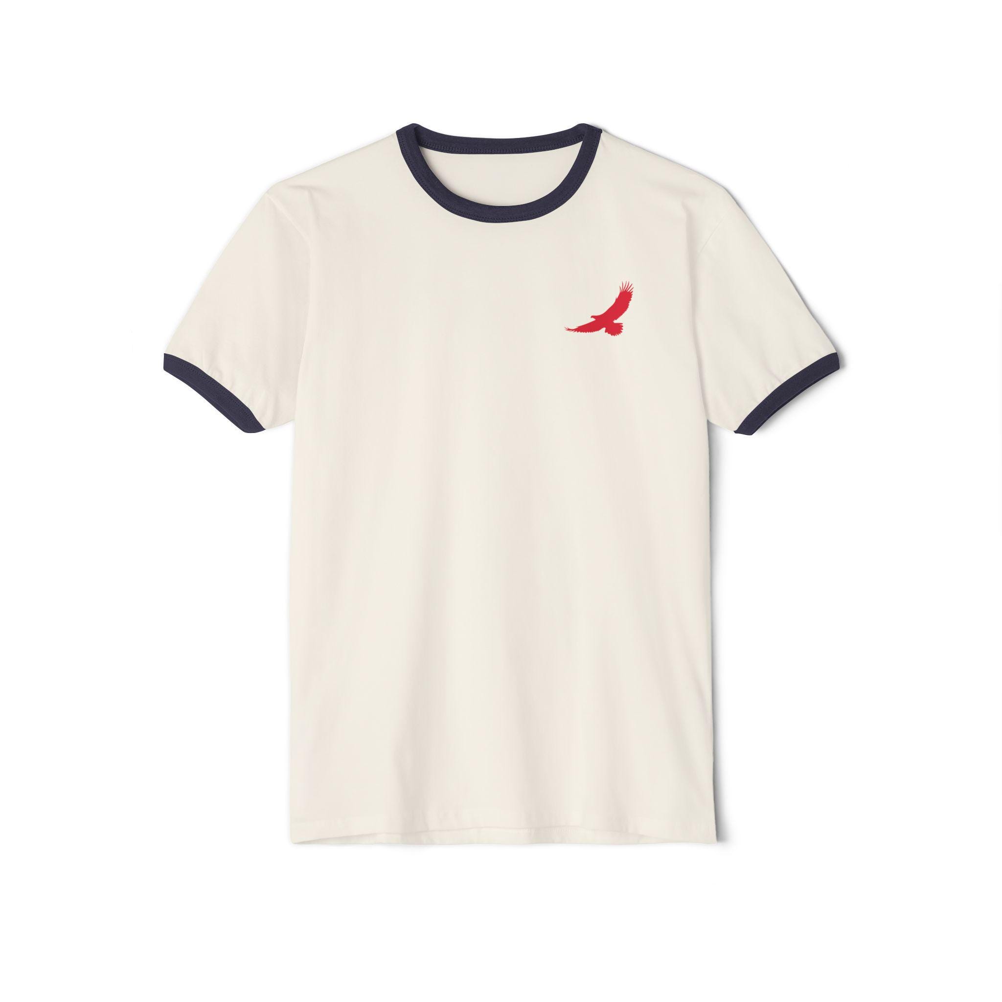 A patriotic Unisex Cotton Ringer Tee perfect for celebrating the 4th of July, featuring 'Home Of The Brave' design. The light fabric and classic fit make it comfortable for all-day wear. Suitable for those who love to show their American pride and celebrate Independence Day.