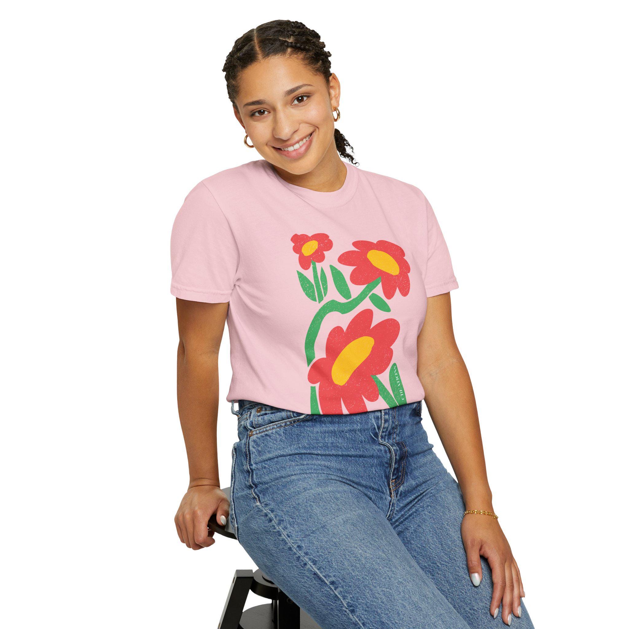 Embrace effortless style with this comfortable Unisex Garment-Dyed T-Shirt. Designed to bring a fresh and vibrant aesthetic, it features a playful flower design that captures the essence of spring and joy. Perfect for casual outings, gatherings with friends, or simply lounging at home, this tee effortlessly blends comfort with trendy, laid-back style. Ideal for anyone who appreciates quality and sustainable fashion, it suits a wide range of occasions such as birthdays, holidays, or as a thoughtful gift for loved ones. Celebrate everyday moments and express your personality with this charming piece! Product features - Available in multiple sizes from S to 4XL for the perfect fit. - Durable double-needle stitching ensures long-lasting wear. - Crafted from garment-dyed fabric for a soft texture and unique color. - Pre-shrunk material guarantees a consistent fit over time. - Made from 100% ethically sourced US cotton, supporting sustainable practices. Care instructions - Machine wash: cold (max 30C or 90F) - Do not bleach - Tumble dry: low heat - Iron, steam or dry: low heat - Do not dryclean