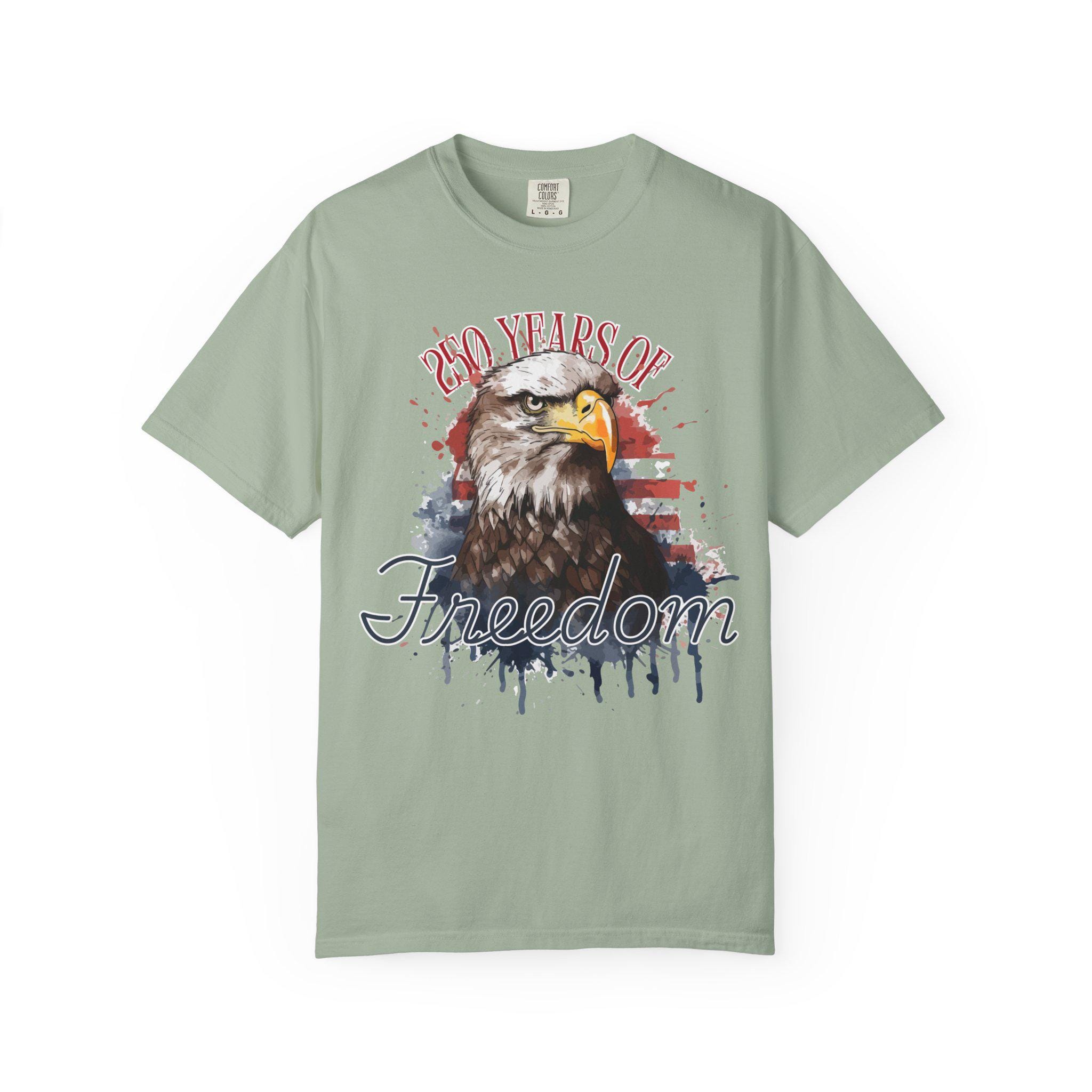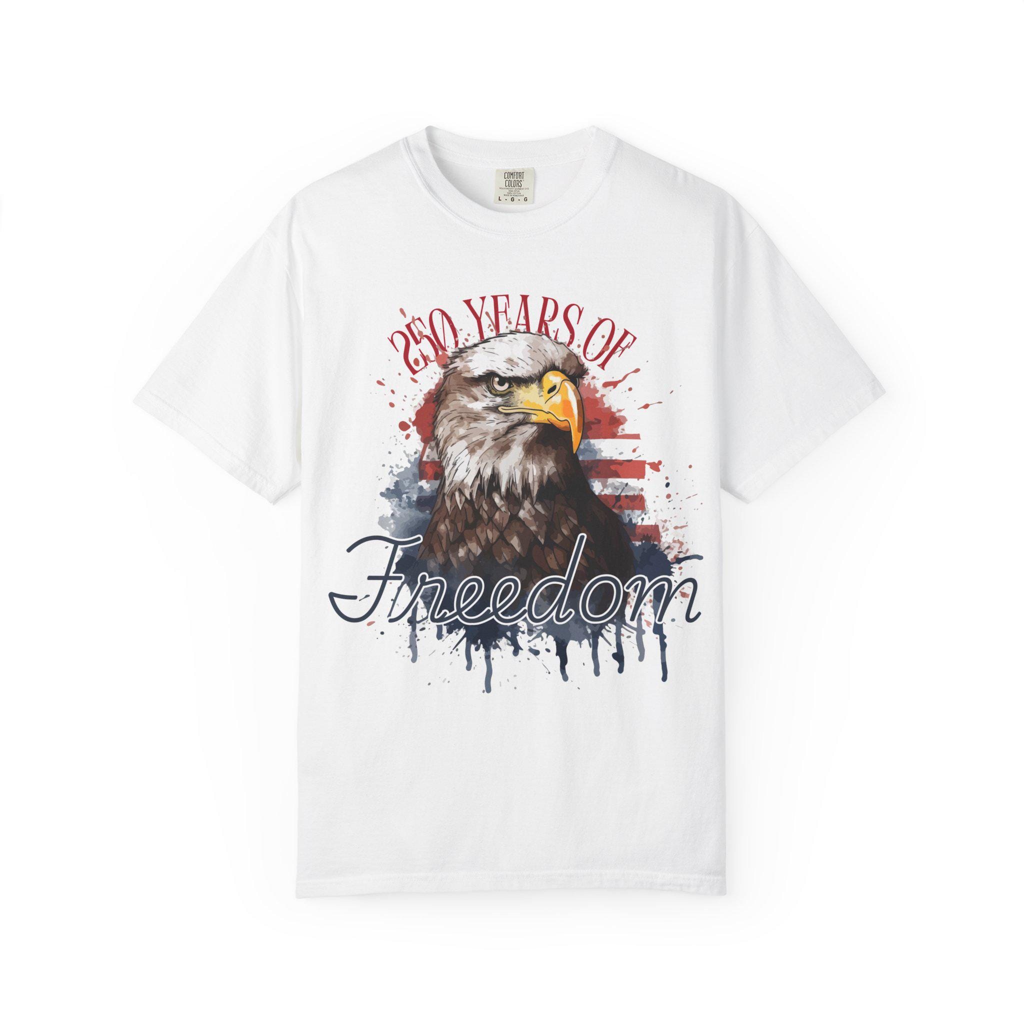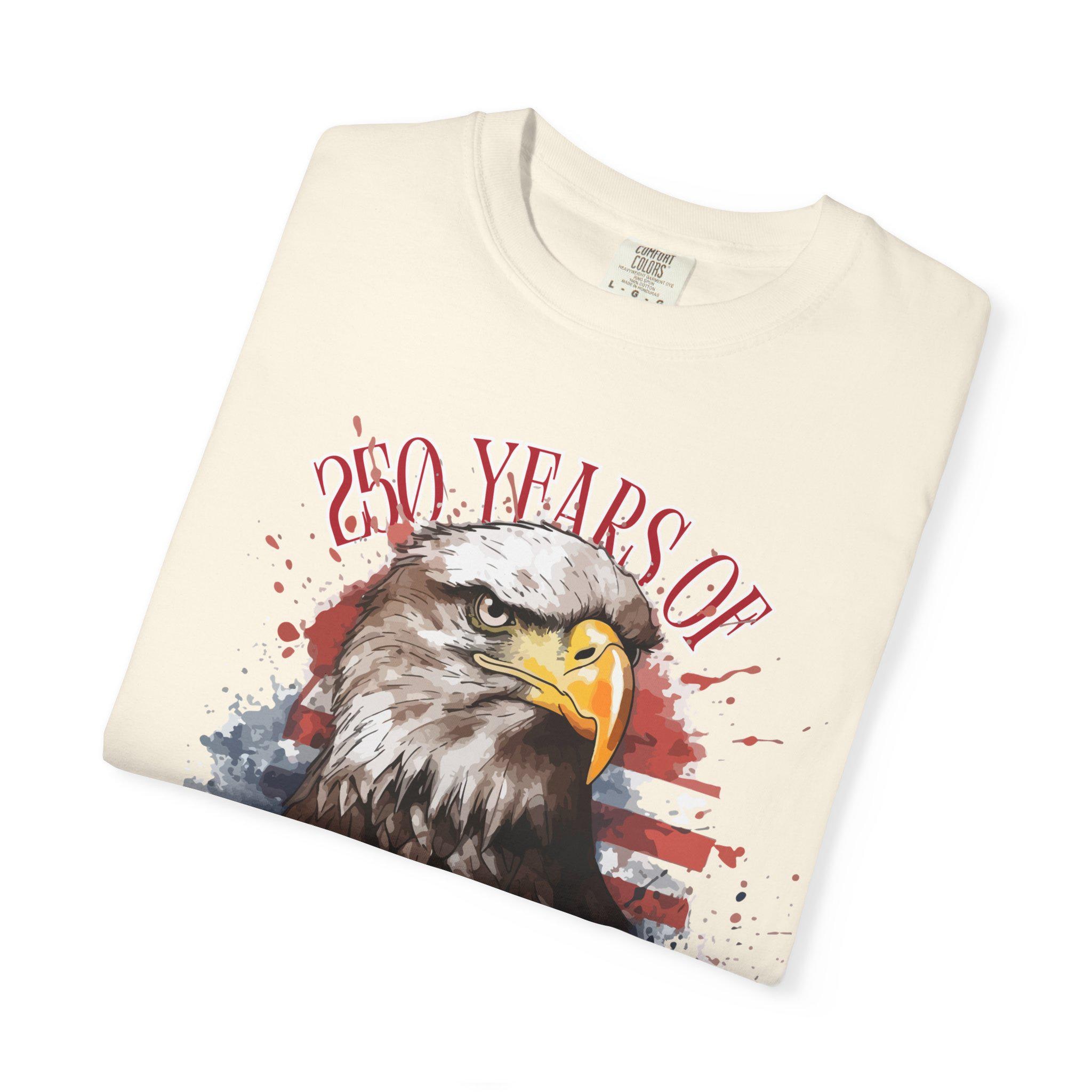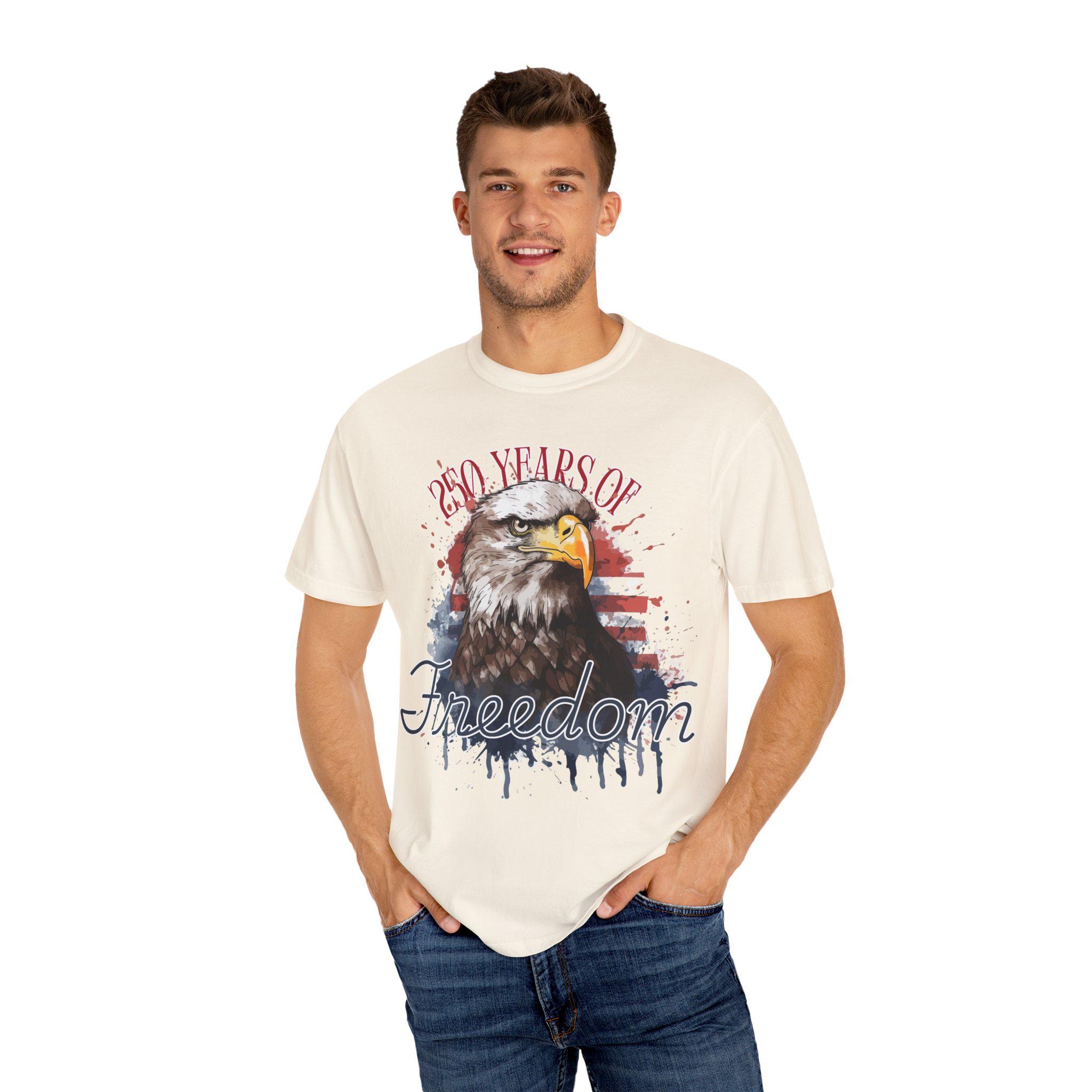 Celebrate United States of America's 250-year anniversary with this unisex garment-dyed T-shirt. The design features a patriotic theme that exudes a feeling of freedom and pride. Perfect for history enthusiasts, patriotic individuals, and anyone celebrating Independence Day or other American holidays and events.