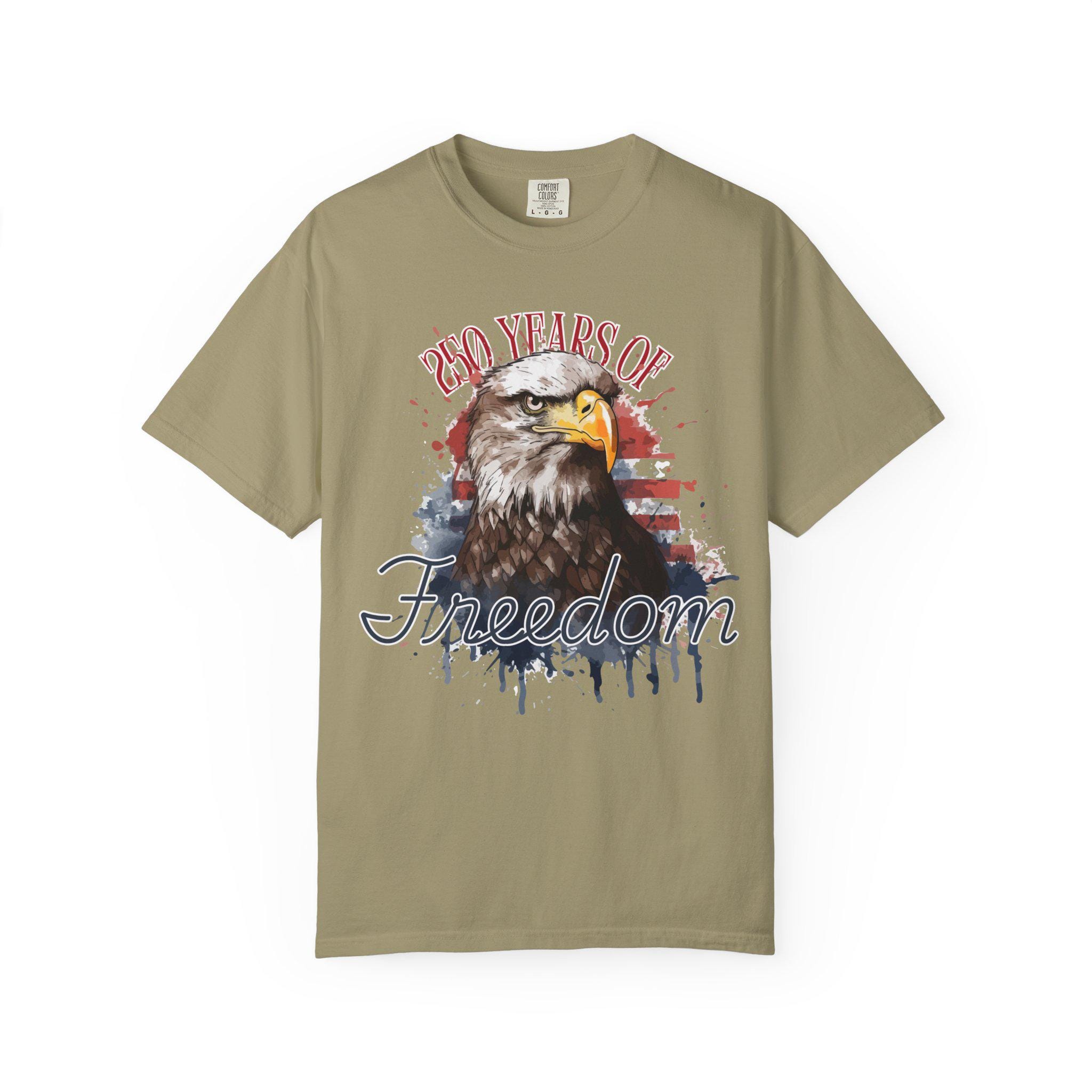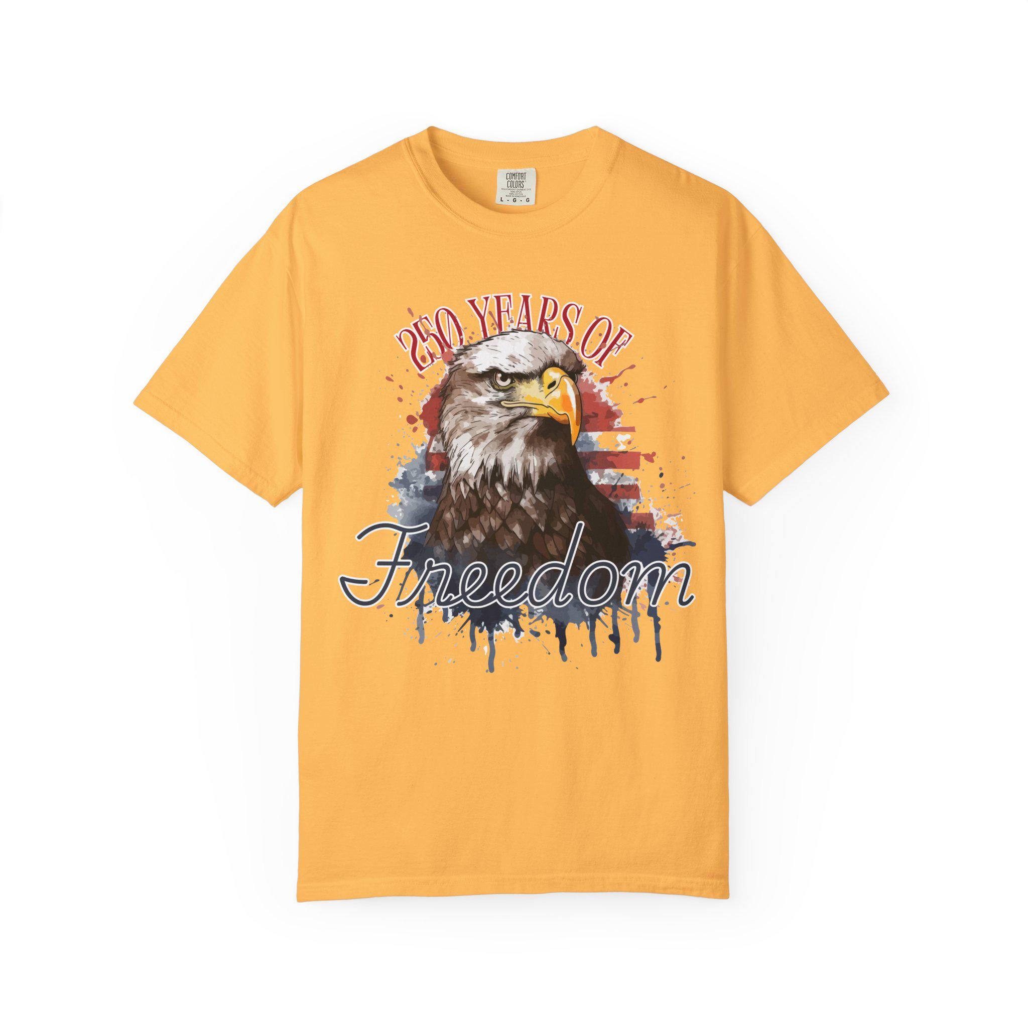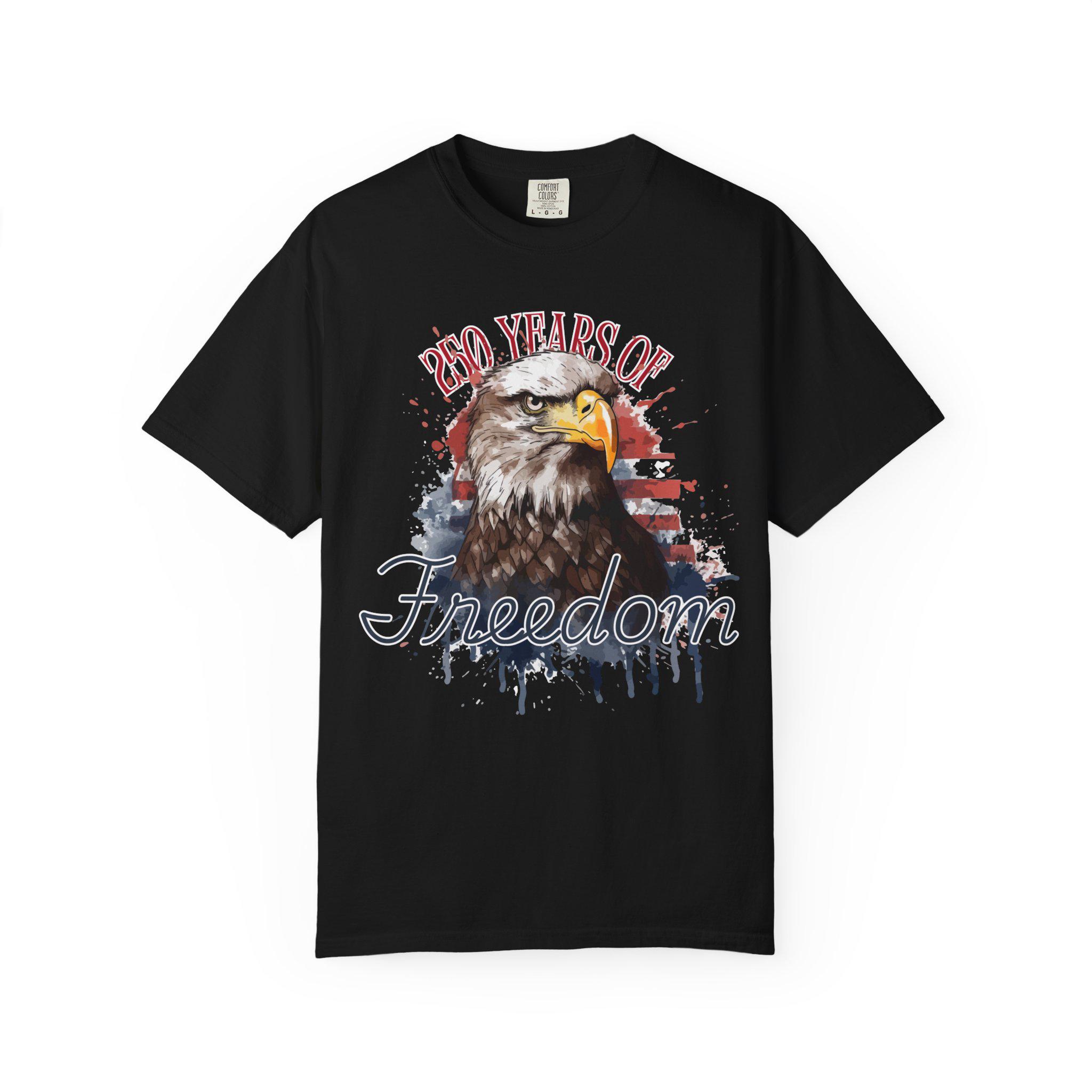 Celebrate United States of America's 250-year anniversary with this unisex garment-dyed T-shirt. The design features a patriotic theme that exudes a feeling of freedom and pride. Perfect for history enthusiasts, patriotic individuals, and anyone celebrating Independence Day or other American holidays and events.