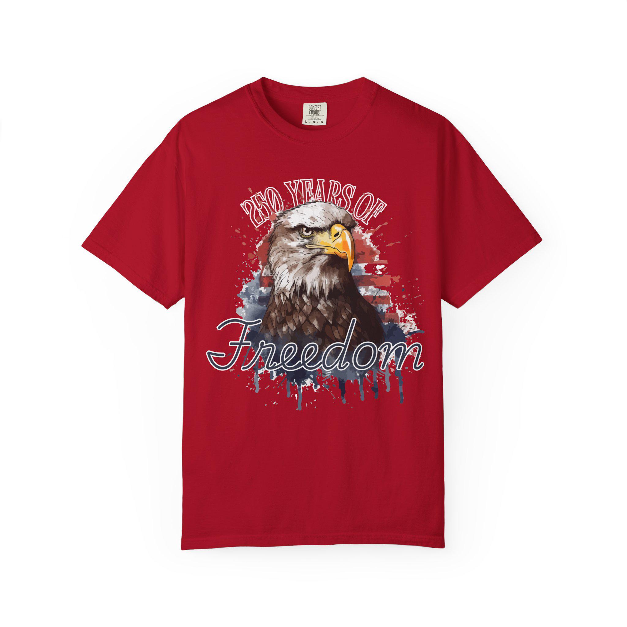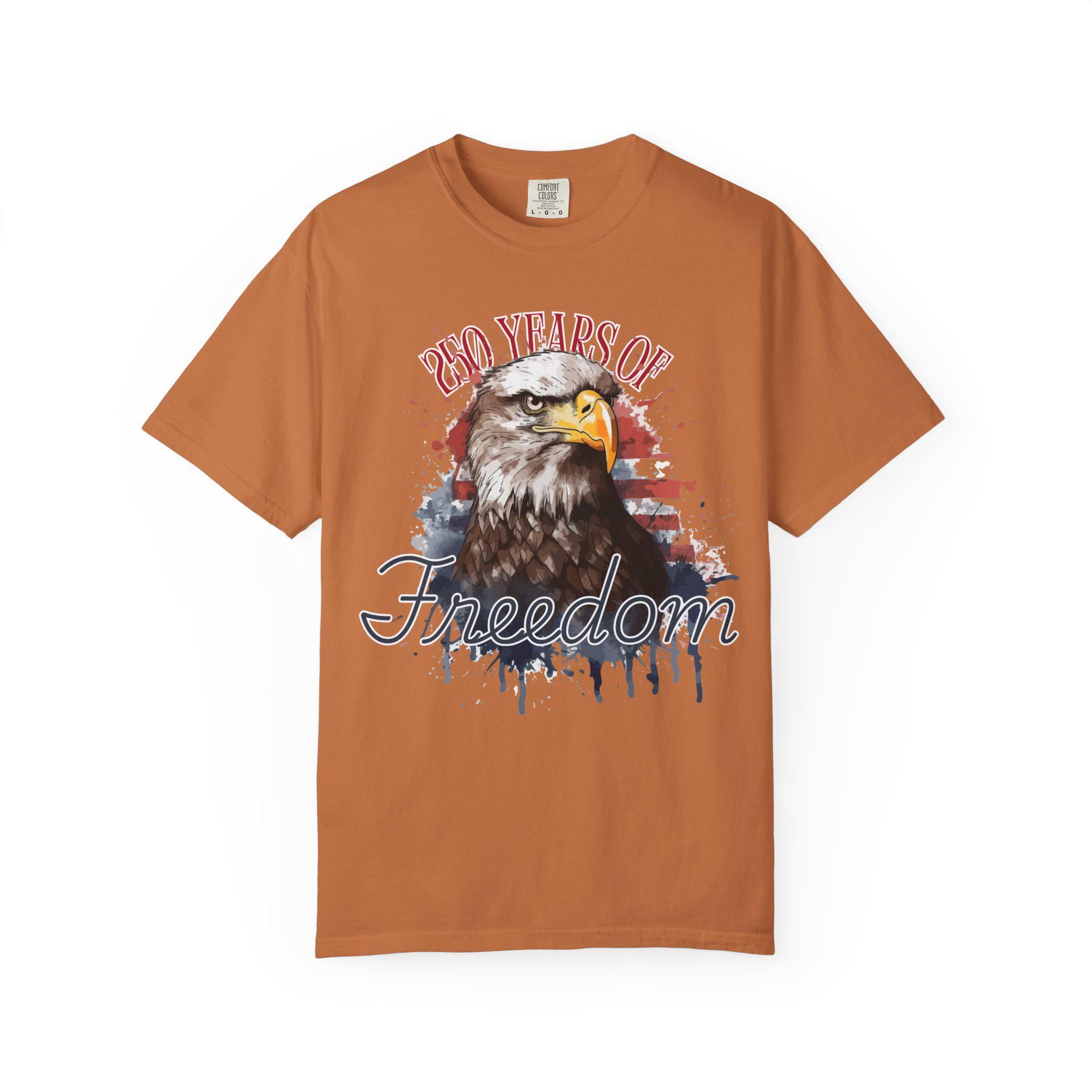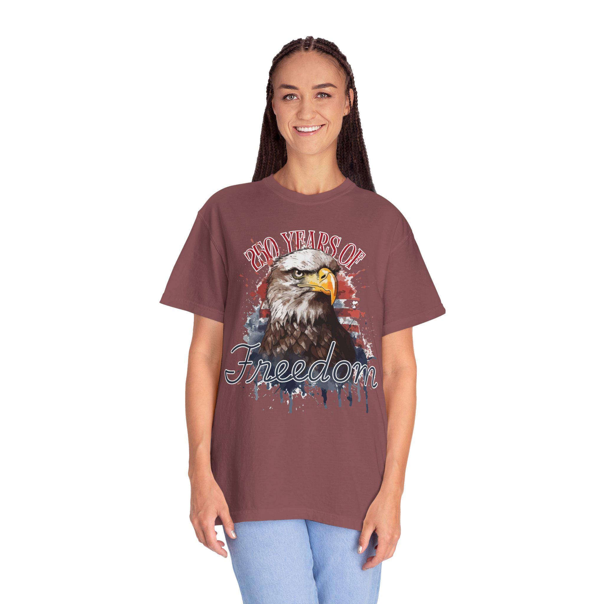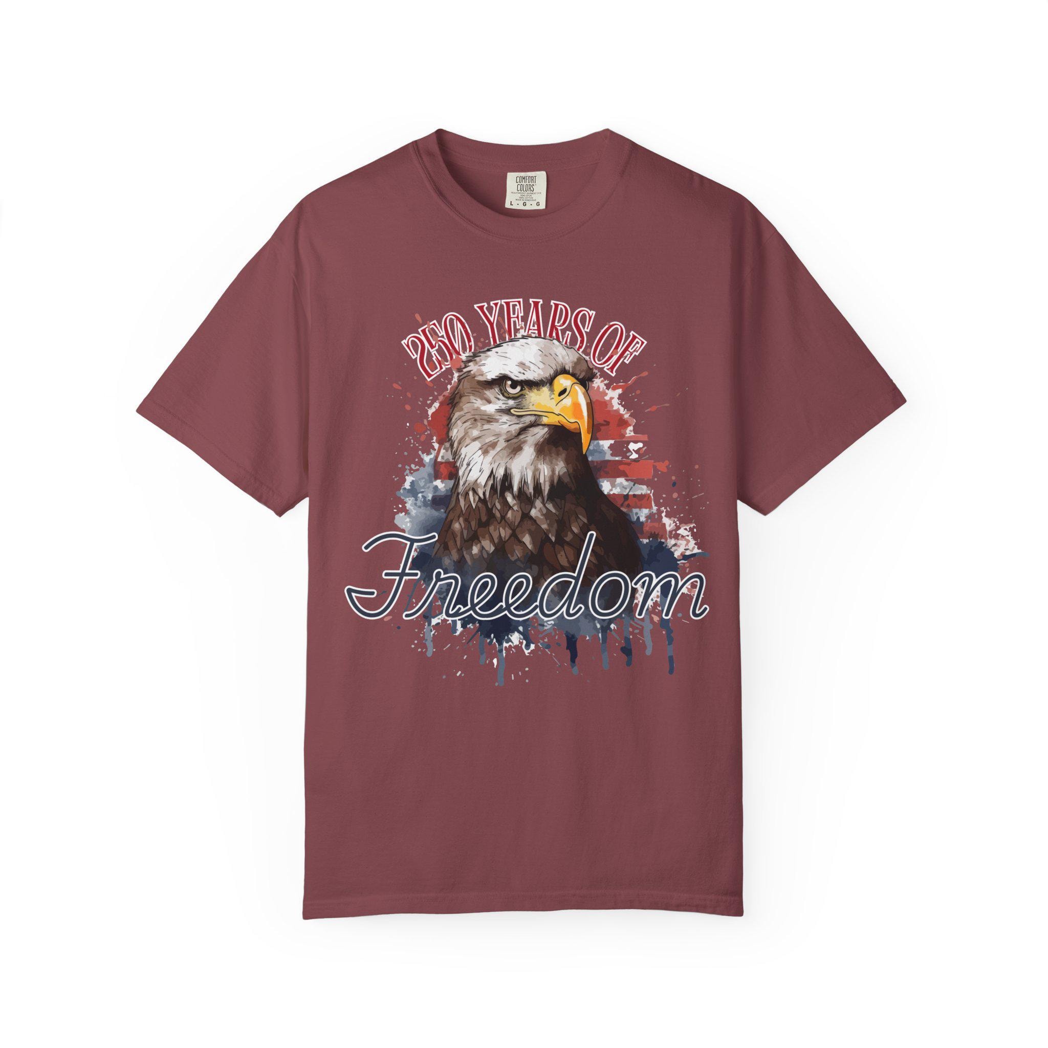 Celebrate United States of America's 250-year anniversary with this unisex garment-dyed T-shirt. The design features a patriotic theme that exudes a feeling of freedom and pride. Perfect for history enthusiasts, patriotic individuals, and anyone celebrating Independence Day or other American holidays and events.