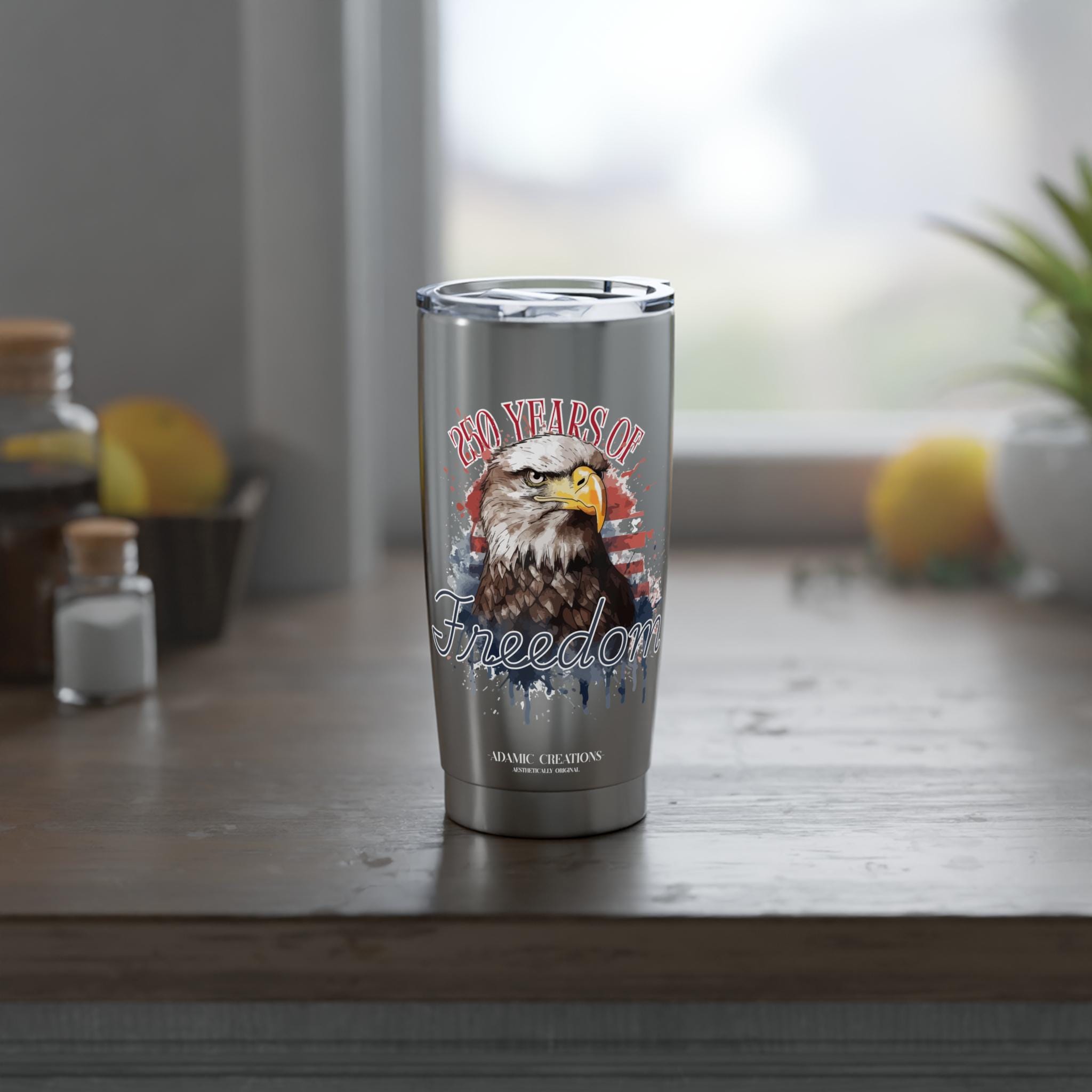 Celebrate 250 years of freedom with this patriotic tumbler featuring vibrant colors and United States of America 250-year anniversary design. Perfect for keeping drinks at the right temperature for hours, this tumbler fits perfectly in a car cup holder. Ideal for patriotic Americans and history buffs, this tumbler is perfect for Fourth of July celebrations and Memorial Day picnics.