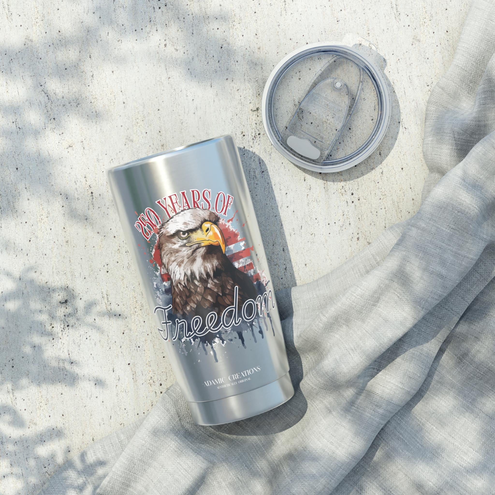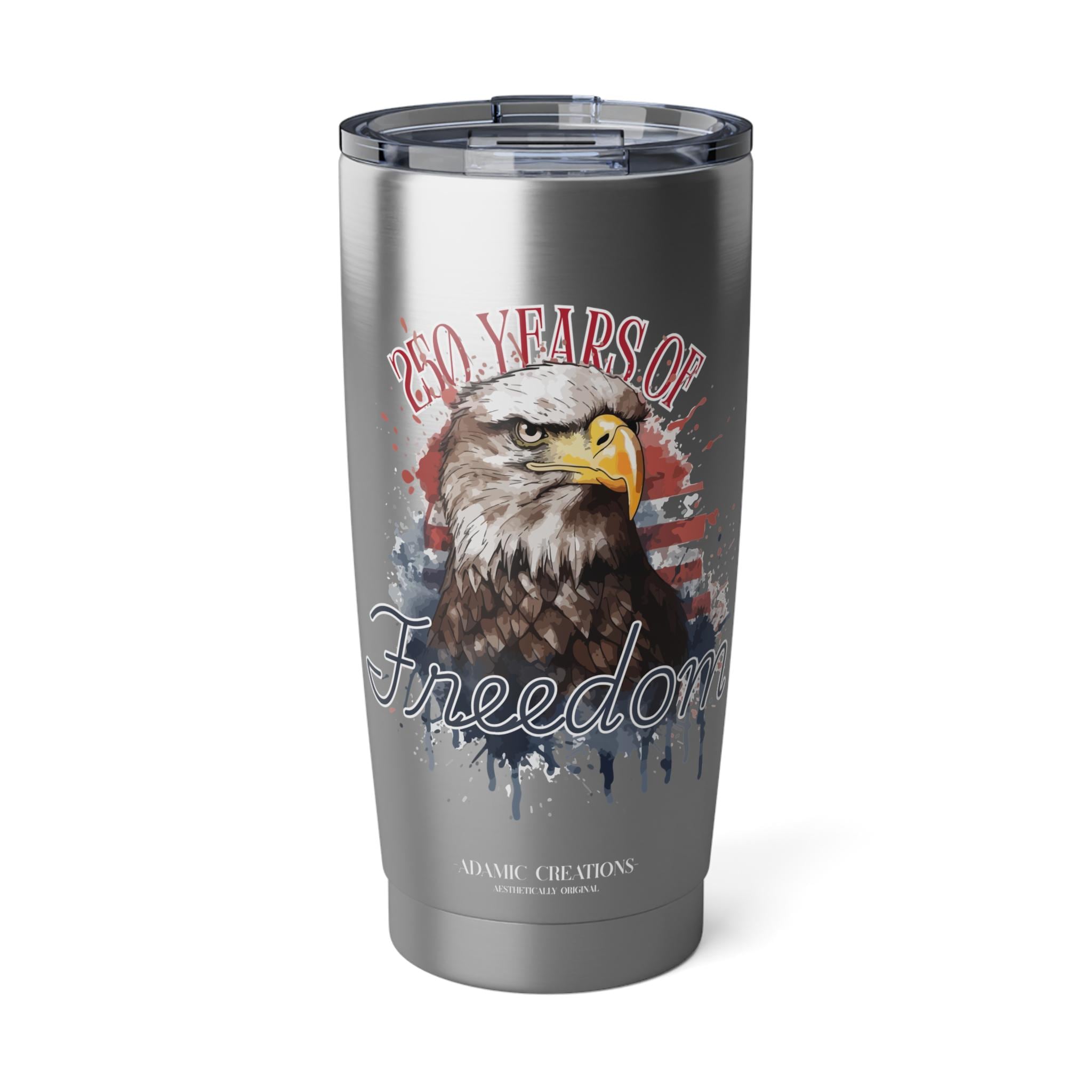 Celebrate 250 years of freedom with this patriotic tumbler featuring vibrant colors and United States of America 250-year anniversary design. Perfect for keeping drinks at the right temperature for hours, this tumbler fits perfectly in a car cup holder. Ideal for patriotic Americans and history buffs, this tumbler is perfect for Fourth of July celebrations and Memorial Day picnics.
