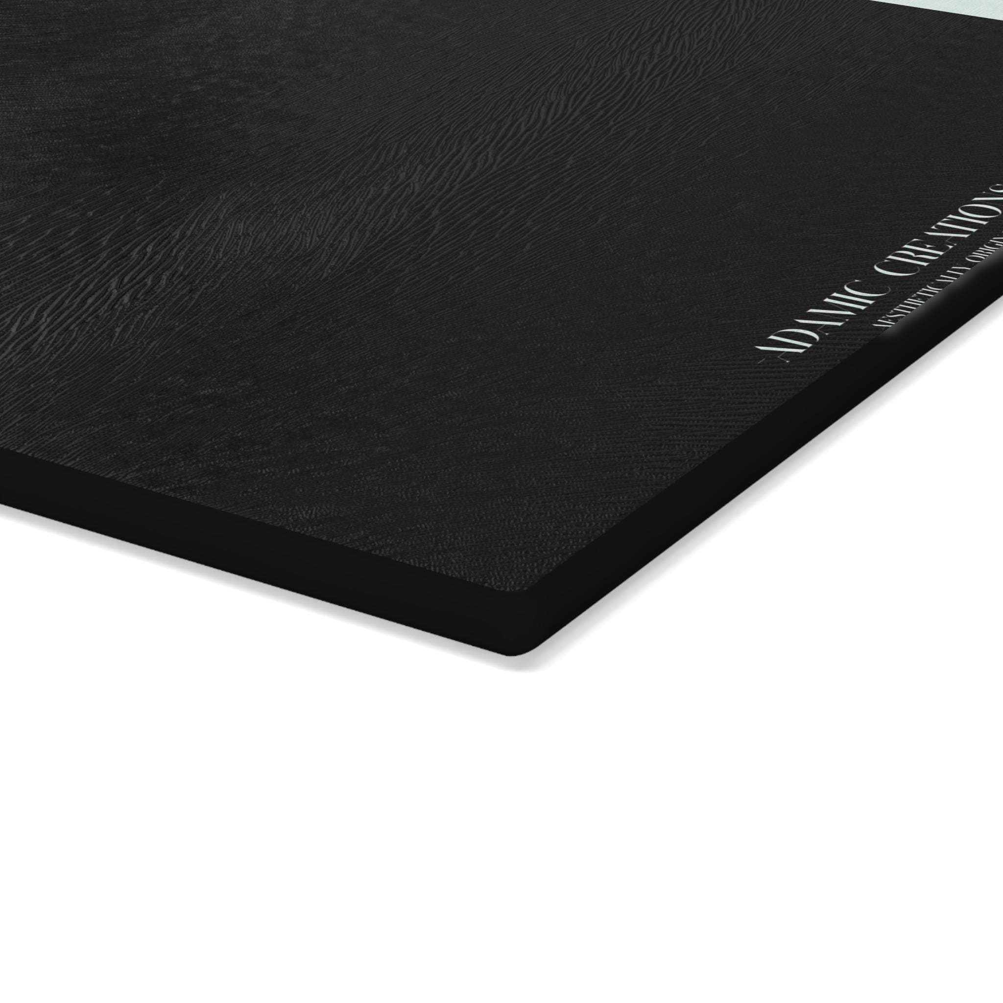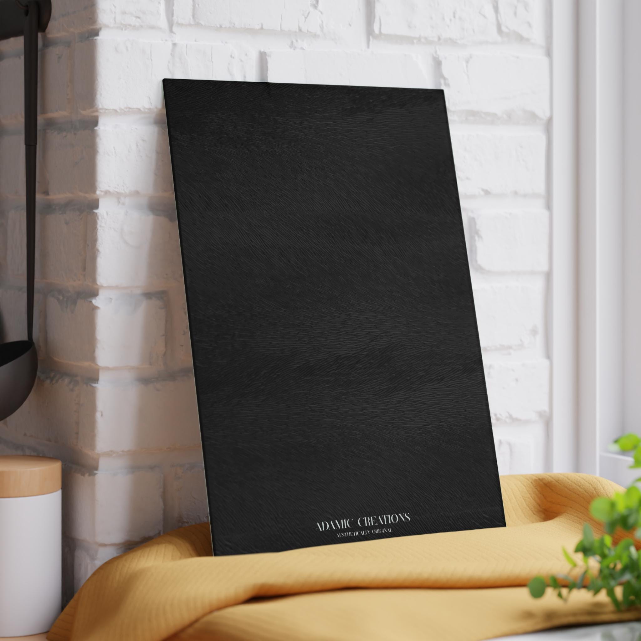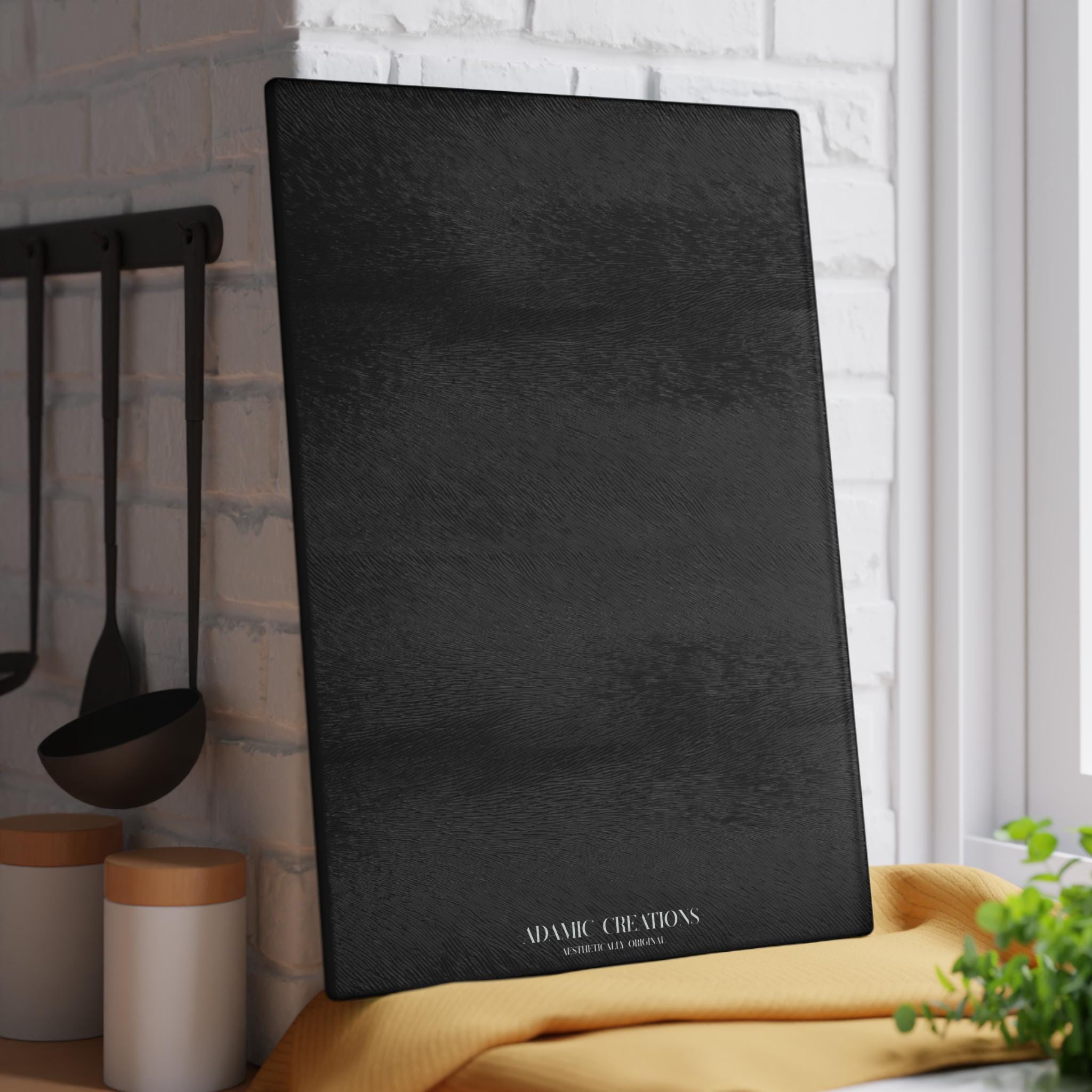 Black tempered glass cutting board with a subtle, textured finish that reads like a quiet statement on your countertop. Its durable printed surface resists scratching so the minimalist design stays crisp through meal prep. Four rubber feet hold the board steady while you chop, slice, or use it as a sleek serving surface. Lightweight yet sturdy, it brings a refined, modern edge to everyday kitchen work — from quick weeknight dinners to laid-back gatherings where presentation matters.