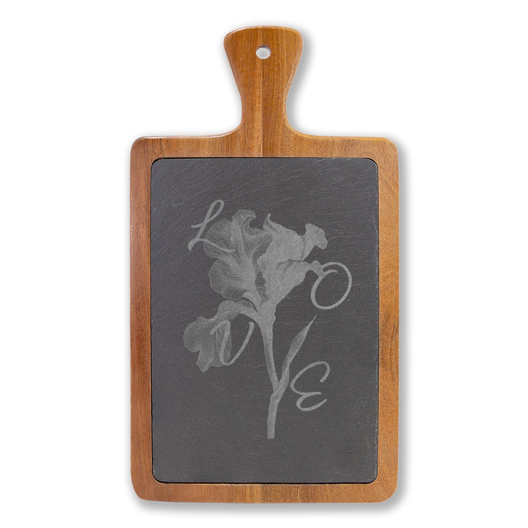 Warm, tactile, and quietly elegant — this engraved acacia and slate charcuterie board brings a slow, thoughtful moment to any gathering. The rich grain of acacia cradles a removable slate round that takes a soft, light-grey engraving, giving your chosen motif a subtle, artisan look. Two hardwood-handled knives nest neatly into carved slots so everything needed for serving is right at hand. Hand-wash care keeps the wood and slate looking their best through many shared dinners and cozy nights in.