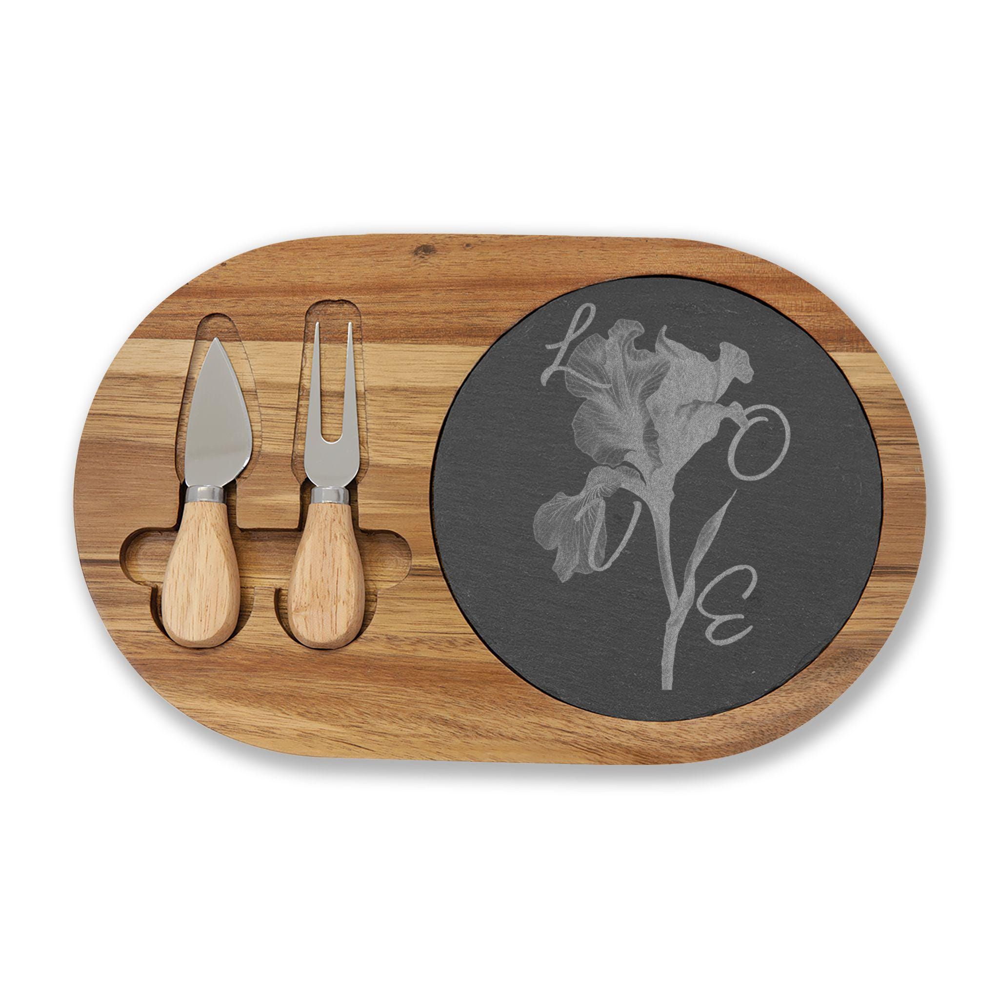 Product features - Acacia wood construction for lasting durability - Removable slate insert that engraves to a soft light-grey - Includes two hardwood-handled cheese knives with dedicated slots - Engraved decoration method for a refined, subtle look - Hand wash only to preserve wood and slate finish