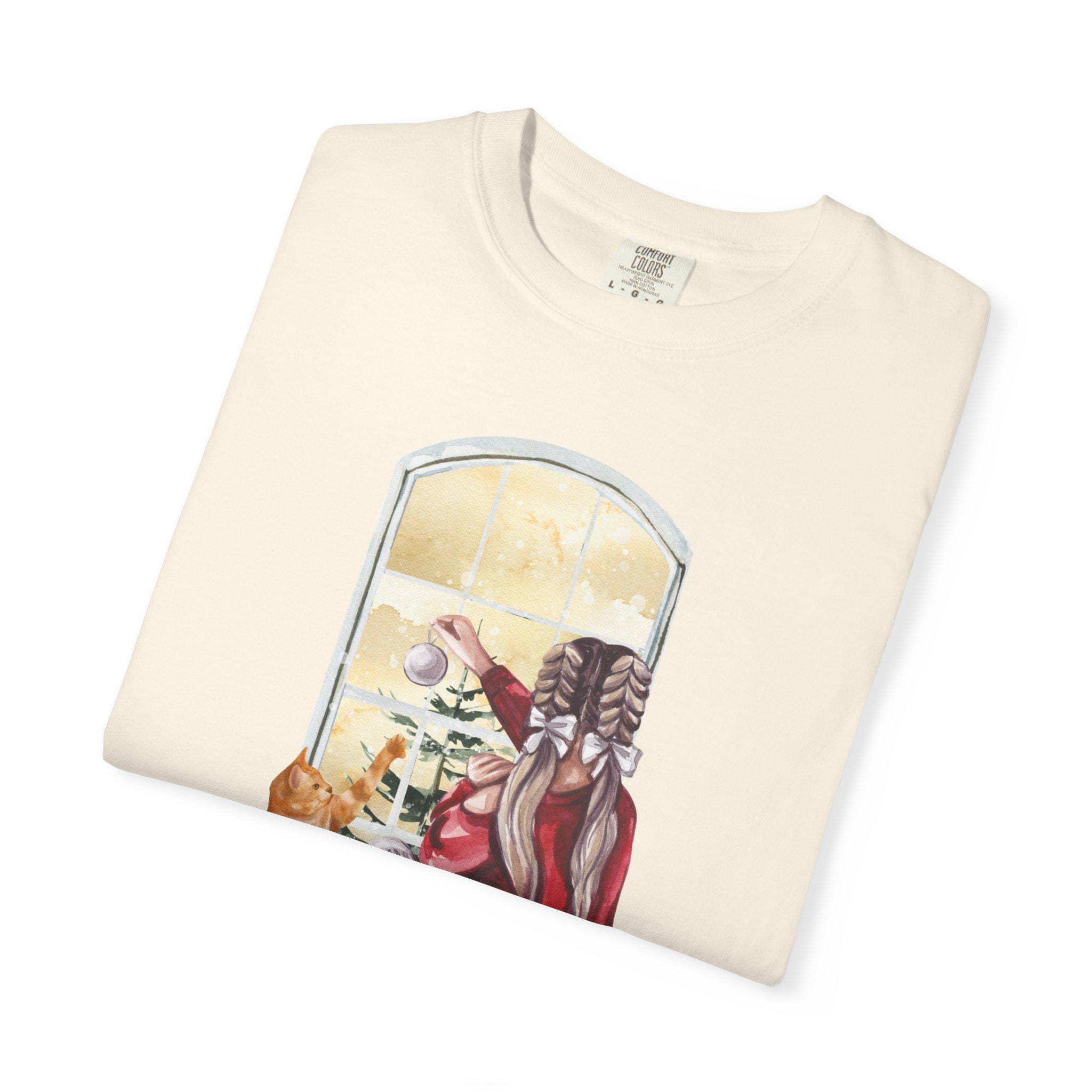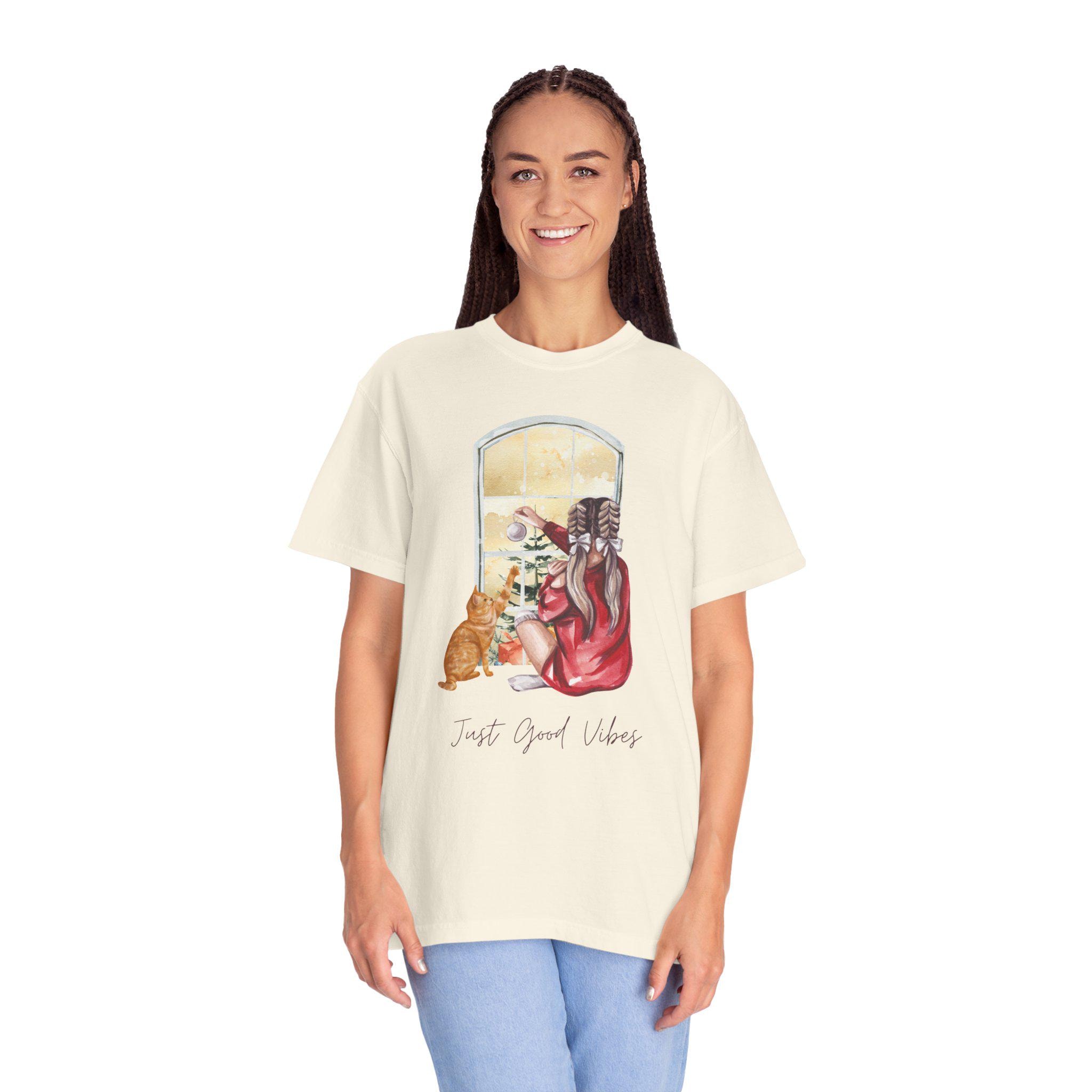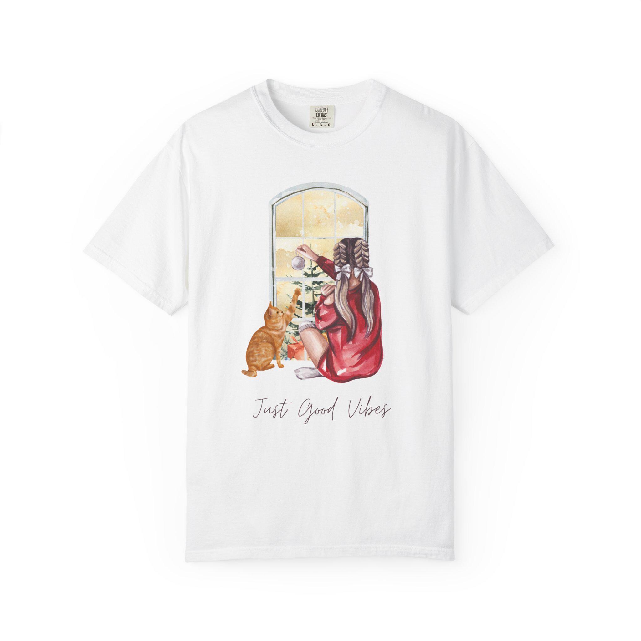 Light and quiet mornings settle into soft color and calm. This garment-dyed tee features an intimate illustration: a person wrapped in a warm sweater, seated by a window with a cat at their side, watching light and snow outside while the words “Just Good Vibes” rest beneath. The heavyweight, 100% ring-spun cotton body feels substantial yet broken-in thanks to the post-construction dyeing. Tubular knit and double-needle stitching give it a smooth, durable silhouette that layers easily under a coat or wears alone for slow, thoughtful days. It’s the kind of shirt you reach for when you want something comfortable to read by a window, walk through a quiet town, or sip something hot while the world moves softly beyond the glass.