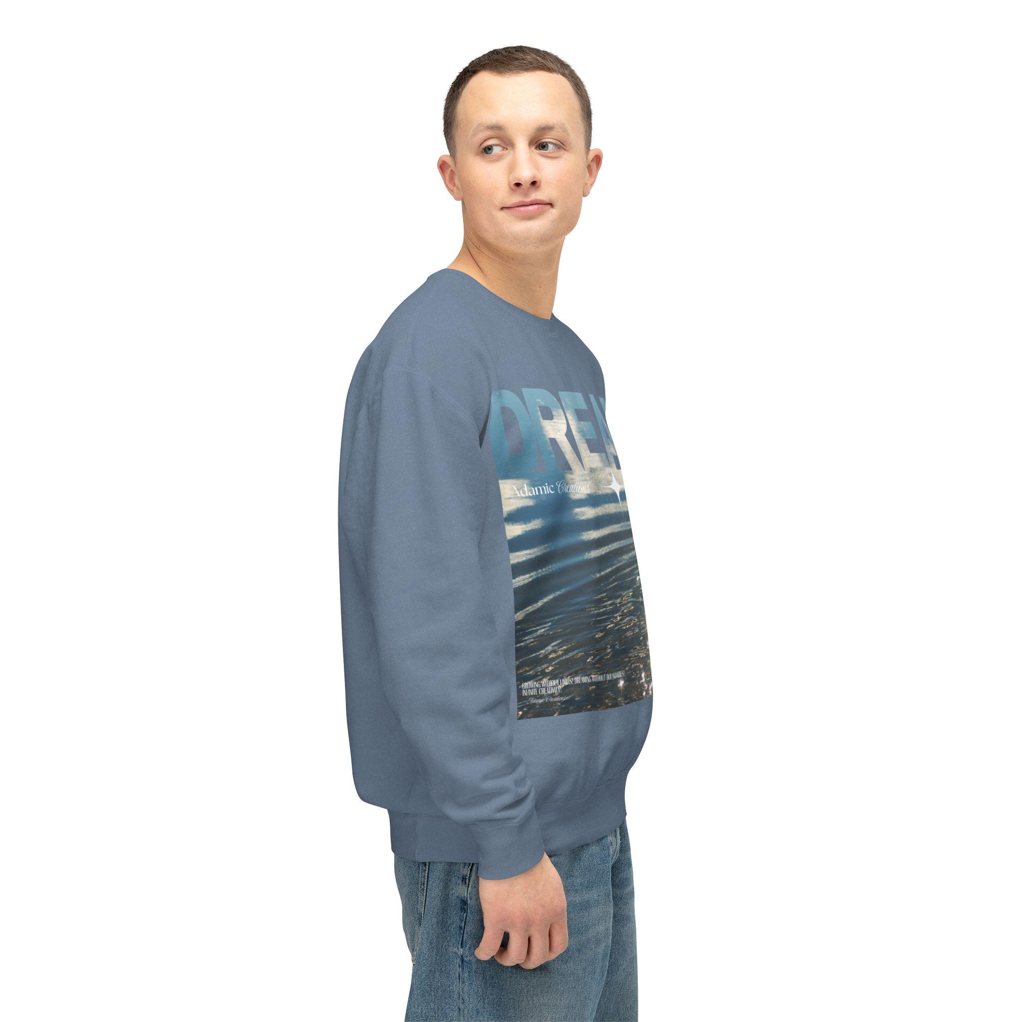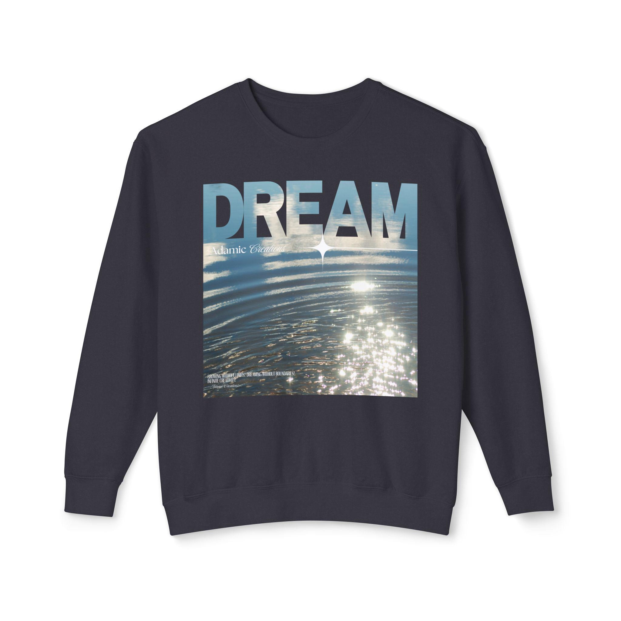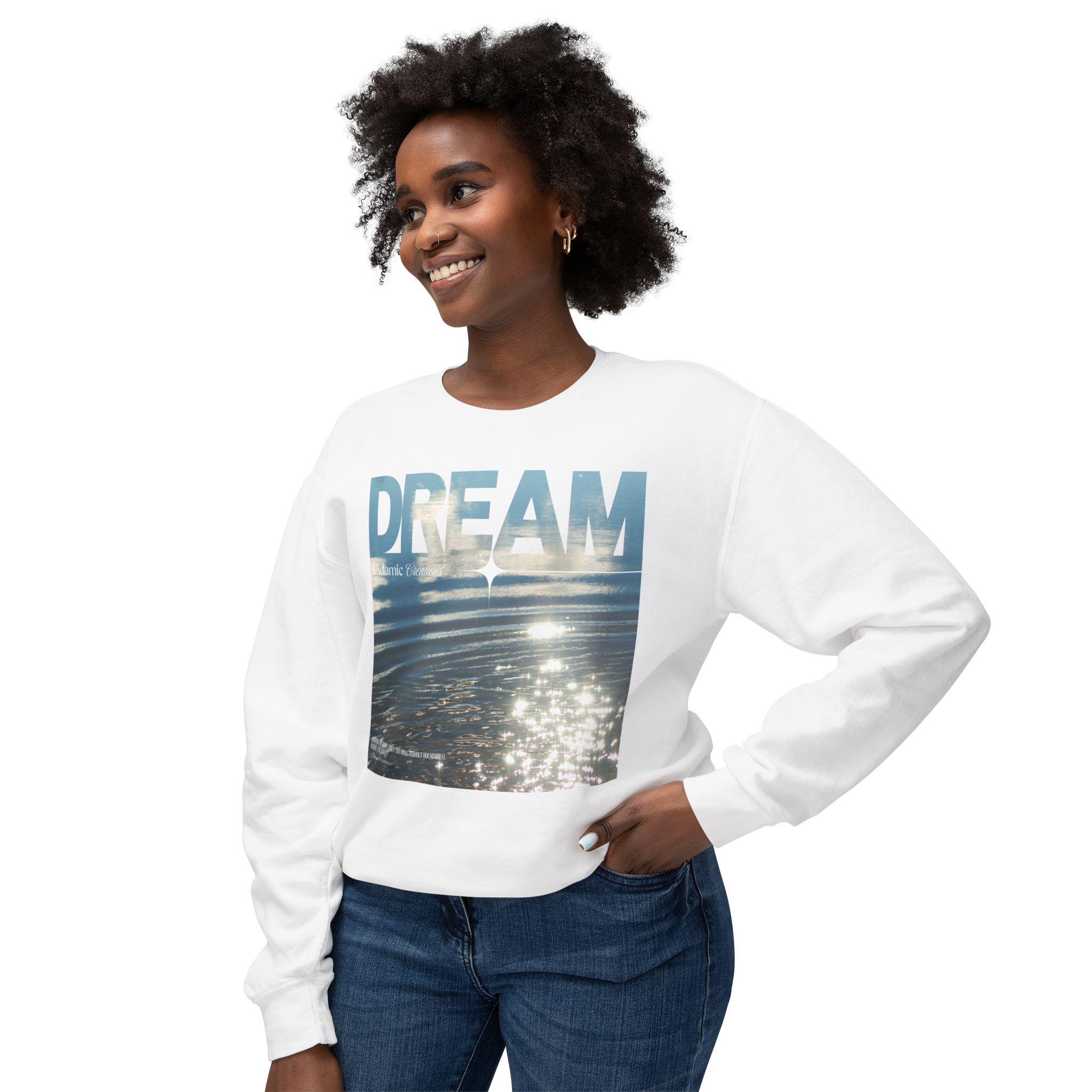 Soft, light, and quietly optimistic — this crewneck carries a calm you can wear. A sunlit water photo fills the chest with gentle ripples while bold, faded letters read “DREAM,” a reminder to slow down and imagine. The relaxed fit and stretchy ribbed cuffs make it easy to layer over a tee or slip on after a morning swim. It moves with you on foggy walks, late-night drives, and slow weekends when you’re chasing small, steady moments of possibility. The breathable cotton keeps things airy without losing structure, and the clean white canvas lets the image breathe. Wear it when you want comfort that feels thoughtful and visuals that spark a quiet smile.