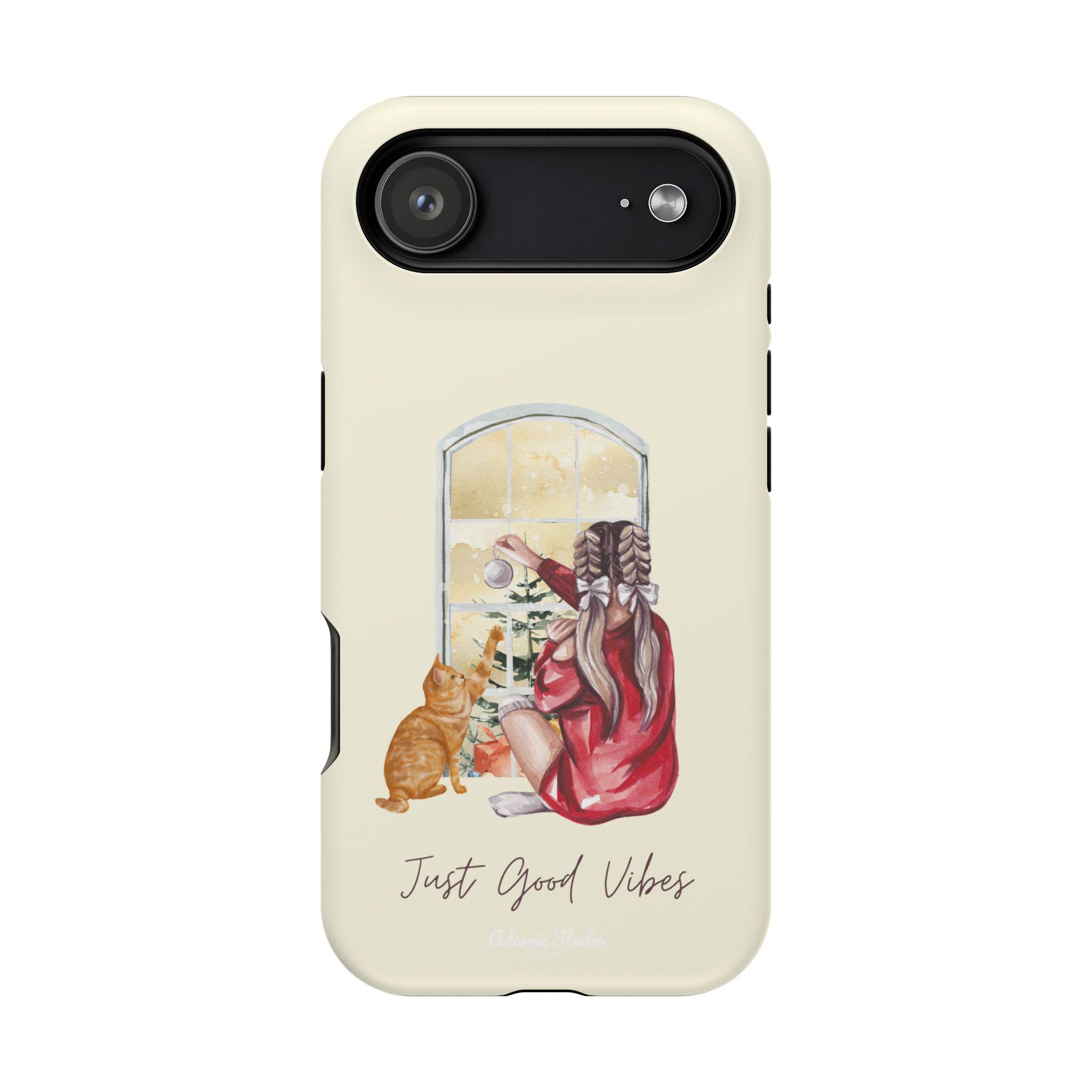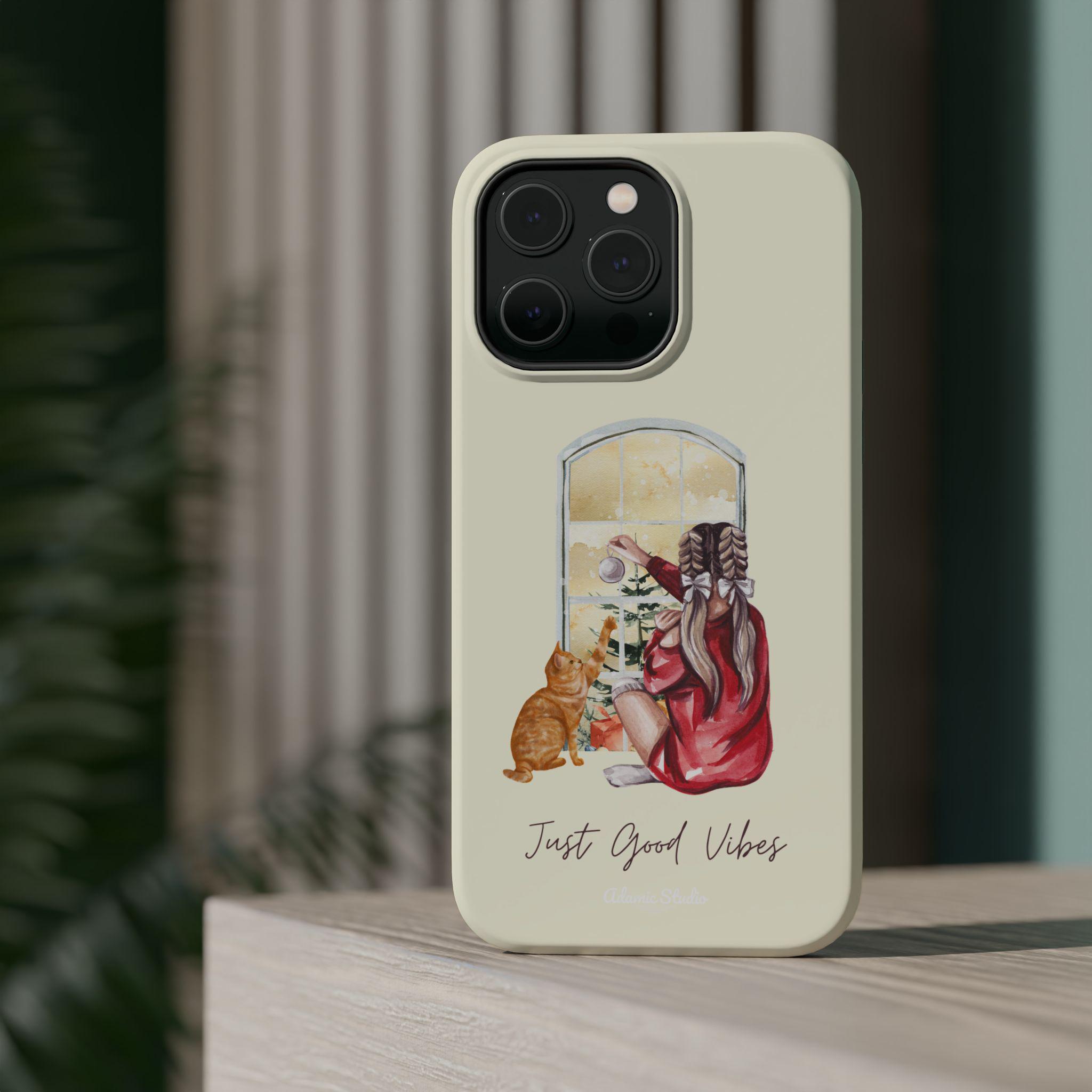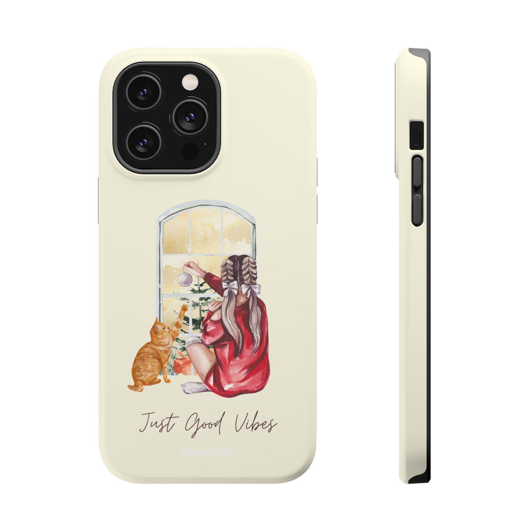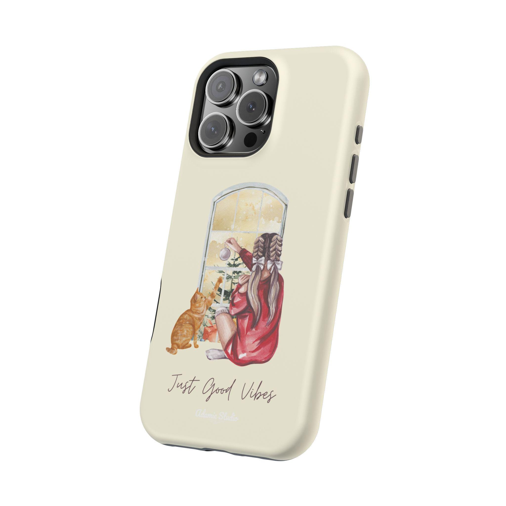 A slim, protective phone case that pairs practical defense with gentle, homey style. The dual-layer shell (polycarbonate exterior with a cushioned TPU liner) shields your phone from everyday bumps and scratches while keeping a light, comfortable feel in hand. The case’s full-wrap print shows a cozy scene—someone in a robe with a cat, looking out a window—printed in vivid, photo-quality color on a choice of glossy or matte finish. Built-in magnets improve compatibility with MagSafe® chargers and accessories so it fits into a modern, on-the-go routine without sacrificing personality. Subtle, calming tones and the handwritten “Just Good Vibes” message make this case feel like a small reminder to slow down and enjoy quiet moments.