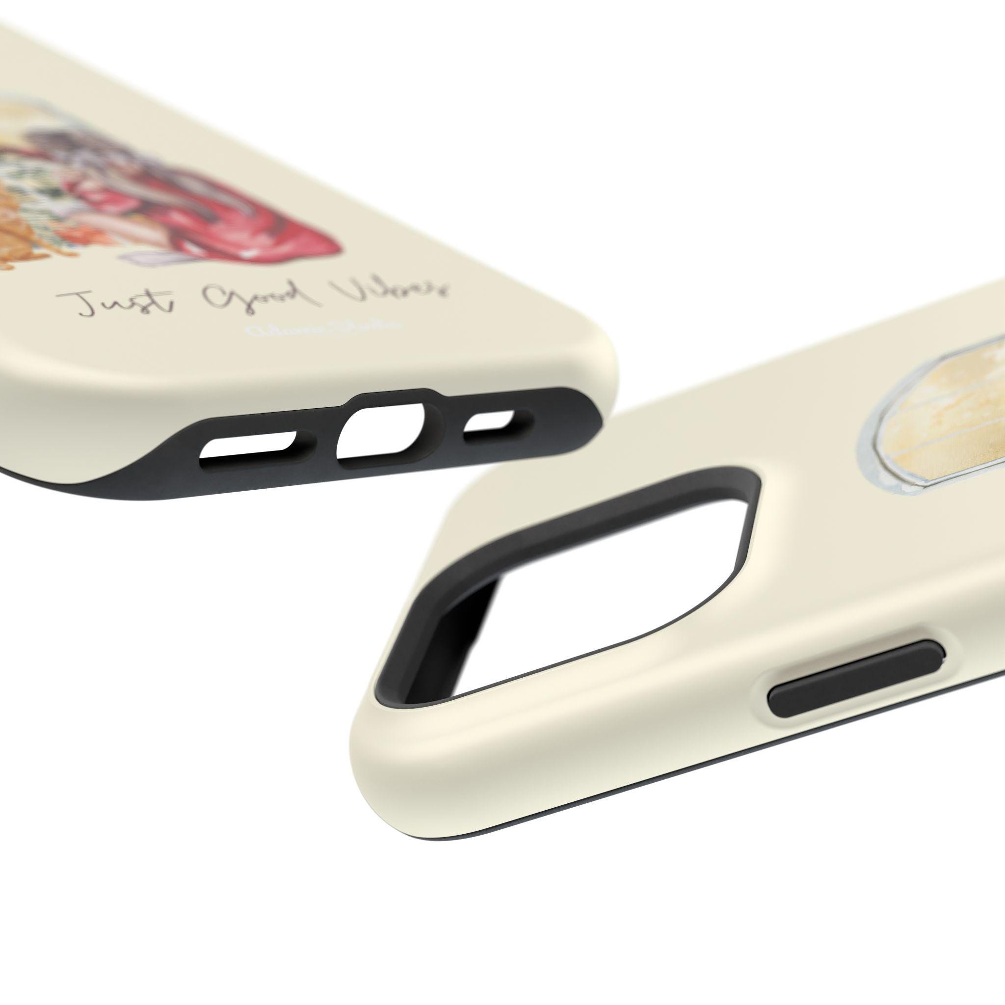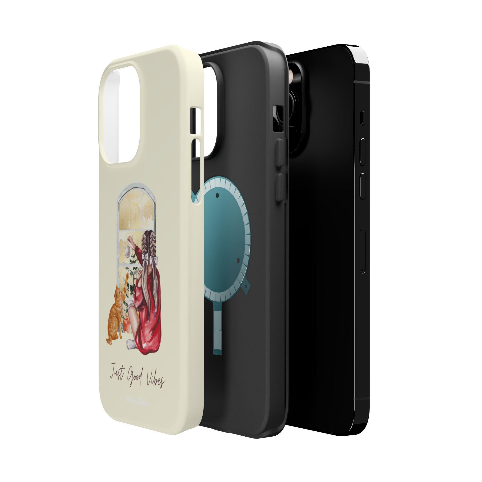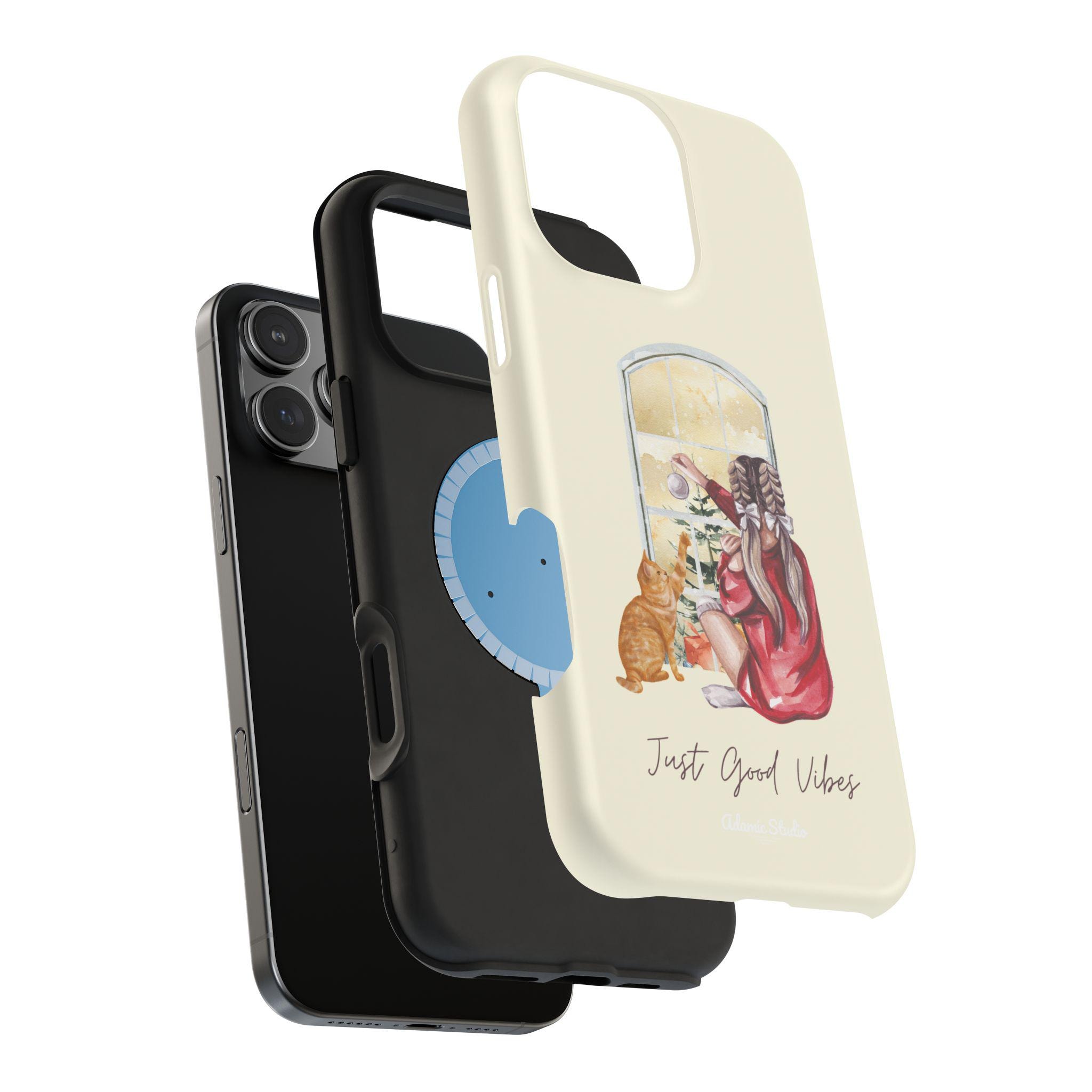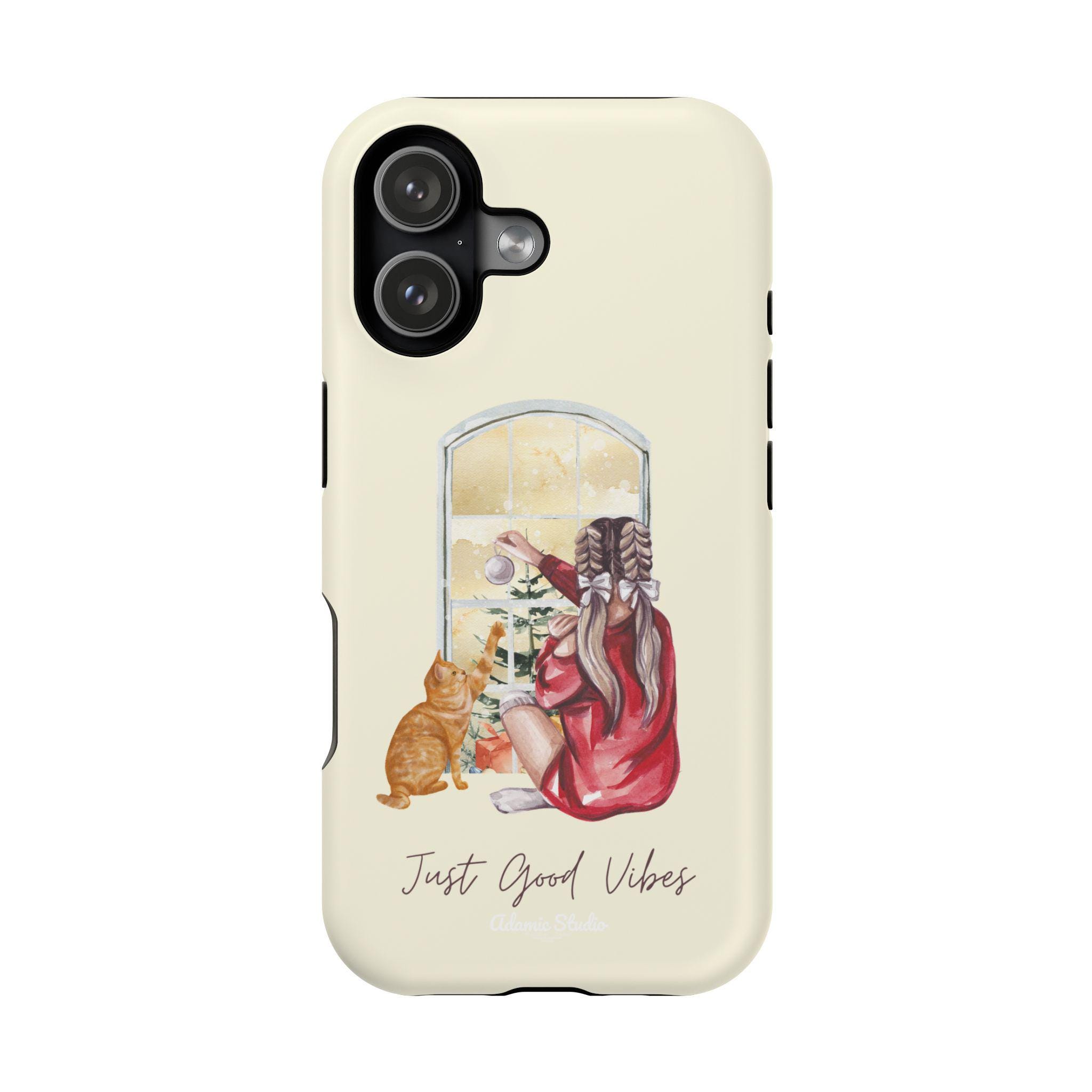 A slim, protective phone case that pairs practical defense with gentle, homey style. The dual-layer shell (polycarbonate exterior with a cushioned TPU liner) shields your phone from everyday bumps and scratches while keeping a light, comfortable feel in hand. The case’s full-wrap print shows a cozy scene—someone in a robe with a cat, looking out a window—printed in vivid, photo-quality color on a choice of glossy or matte finish. Built-in magnets improve compatibility with MagSafe® chargers and accessories so it fits into a modern, on-the-go routine without sacrificing personality. Subtle, calming tones and the handwritten “Just Good Vibes” message make this case feel like a small reminder to slow down and enjoy quiet moments.