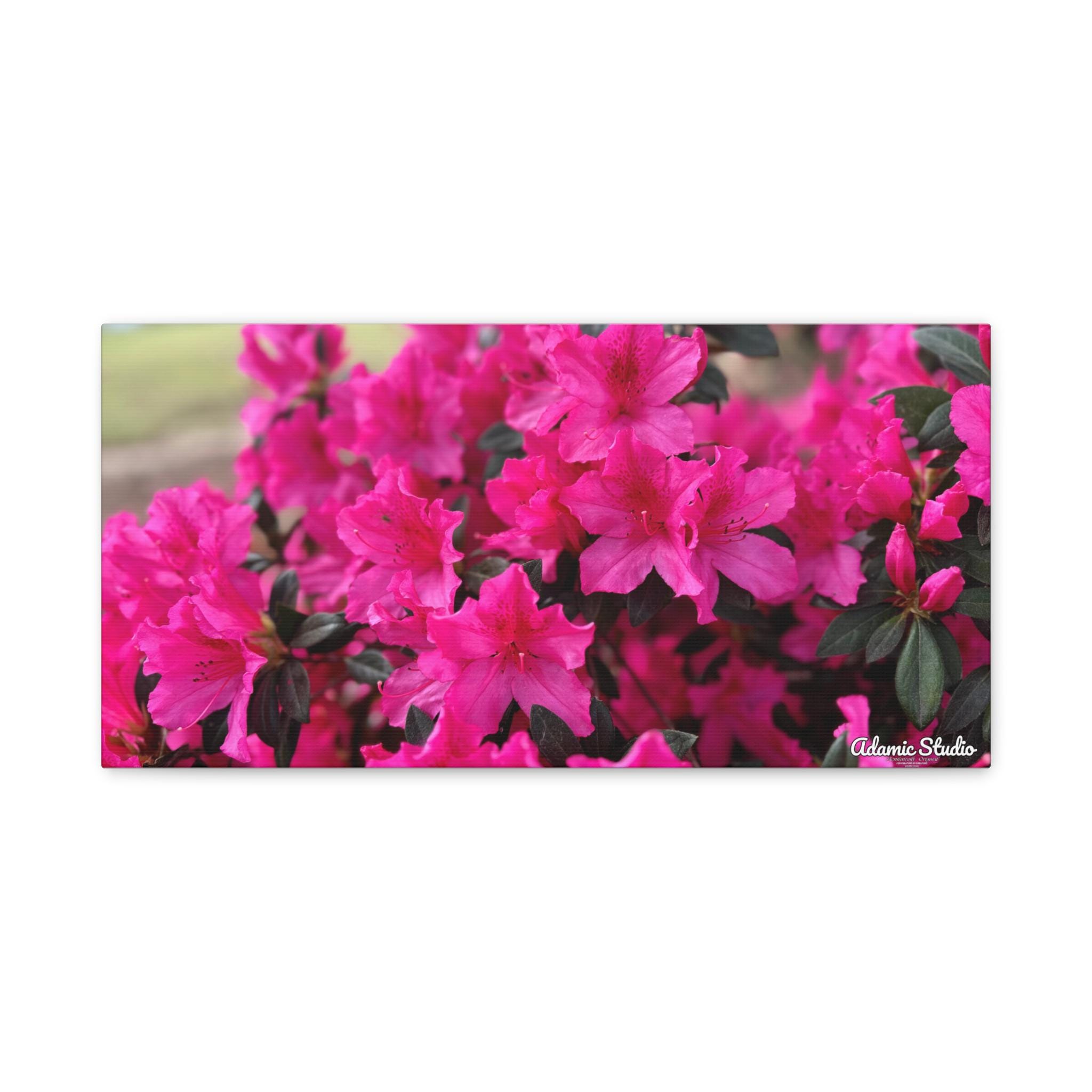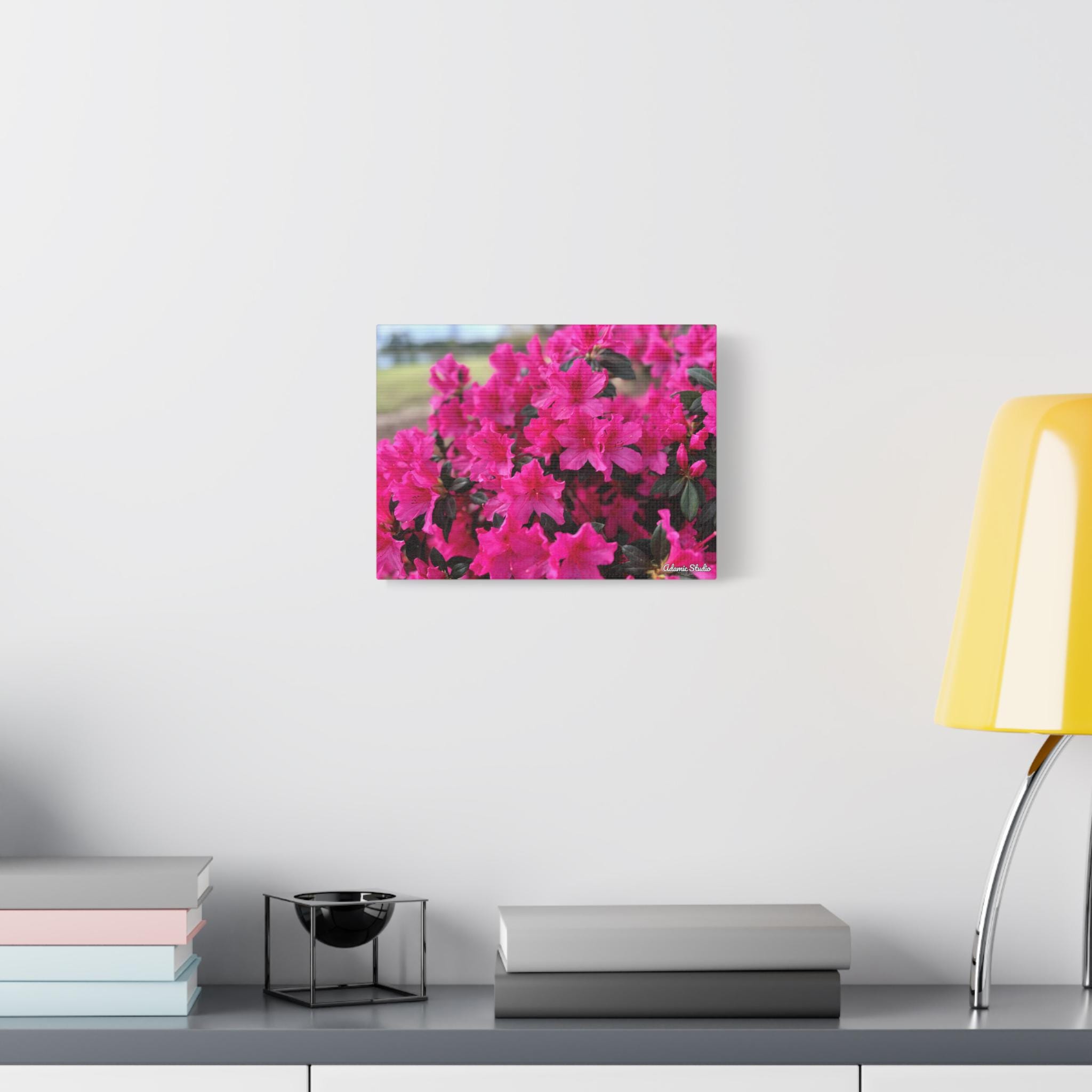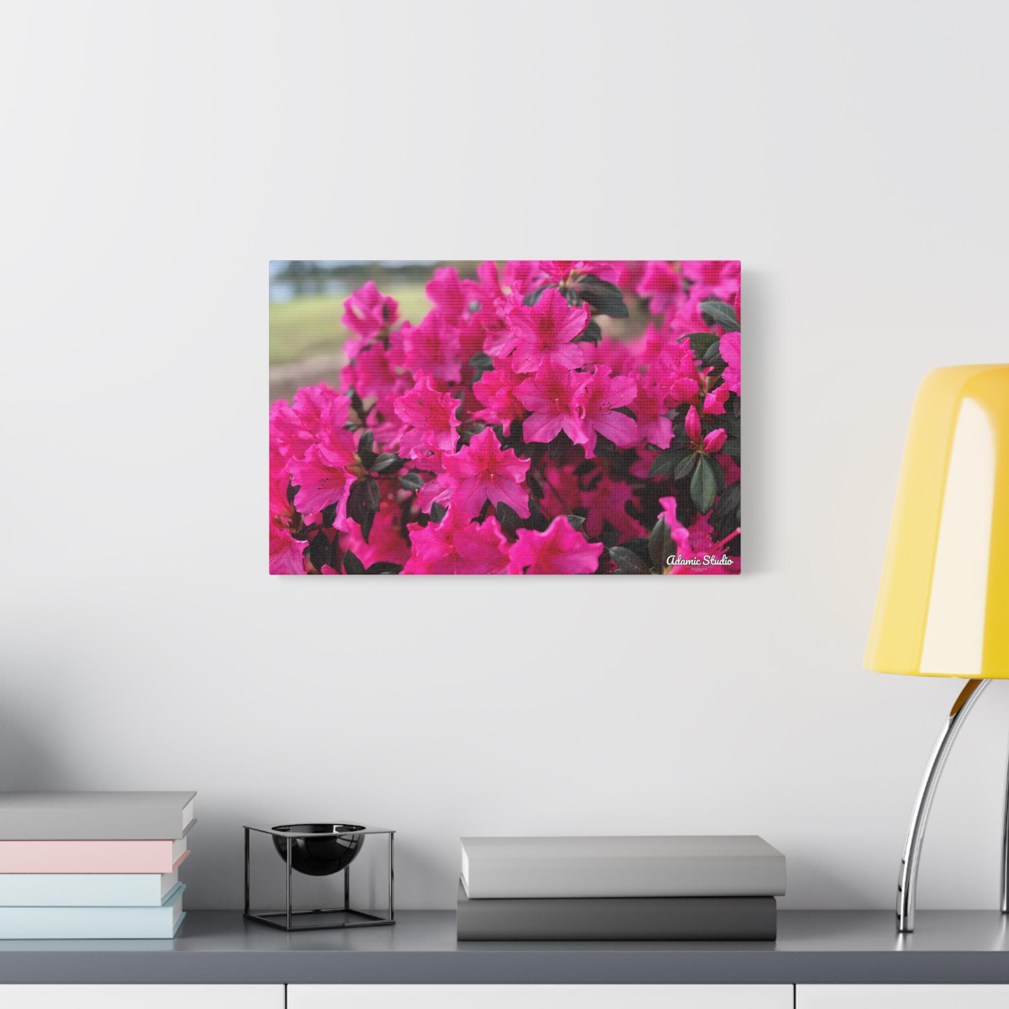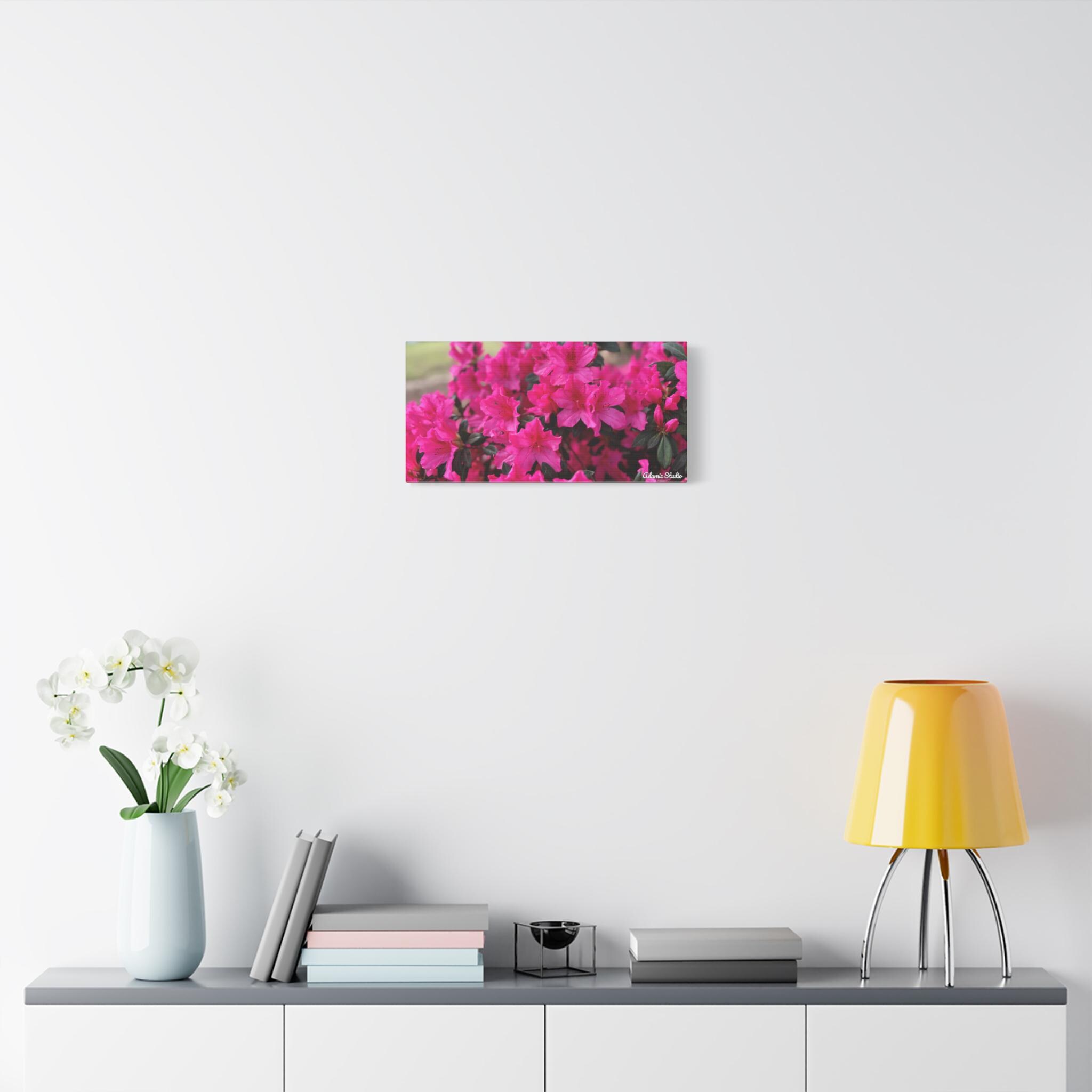 A vibrant matte canvas print that brings a burst of fuchsia azaleas into any room. The stretched 1.25" profile gives the image a clean, gallery-ready presence while the matte finish softens glare and enhances rich, natural tones. Printed with UL-certified Greenguard Gold latex inks on a durable cotton/poly canvas, the piece feels both refined and responsibly made. The lightweight radiata pine frame and discreet rubber feet keep the canvas steady and easy to hang—choose horizontal, vertical, or square orientations across multiple size options to suit your wall. This canvas creates a warm, blooming corner in living rooms, sunrooms, or cozy studios, capturing a moment of garden joy that settles into everyday life.