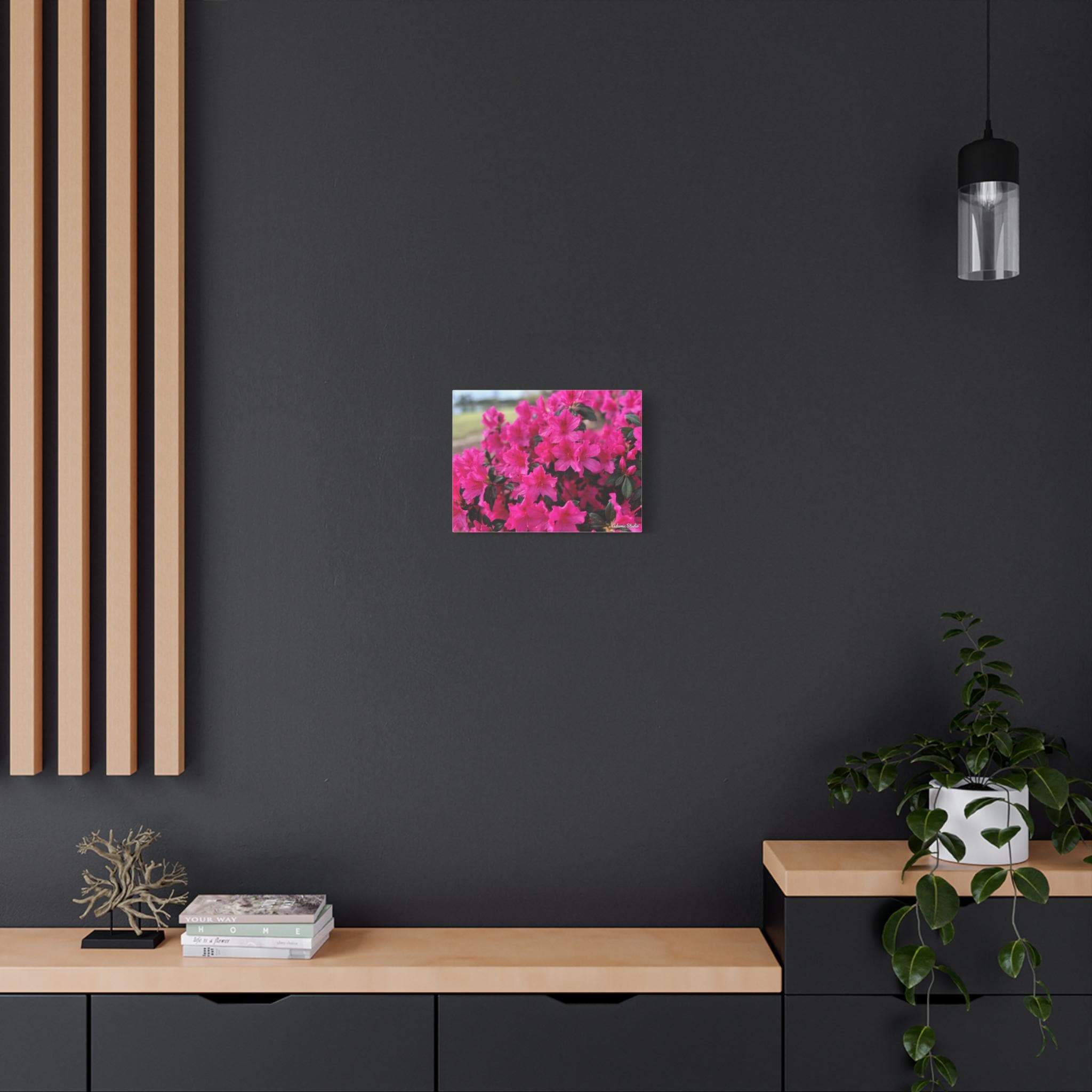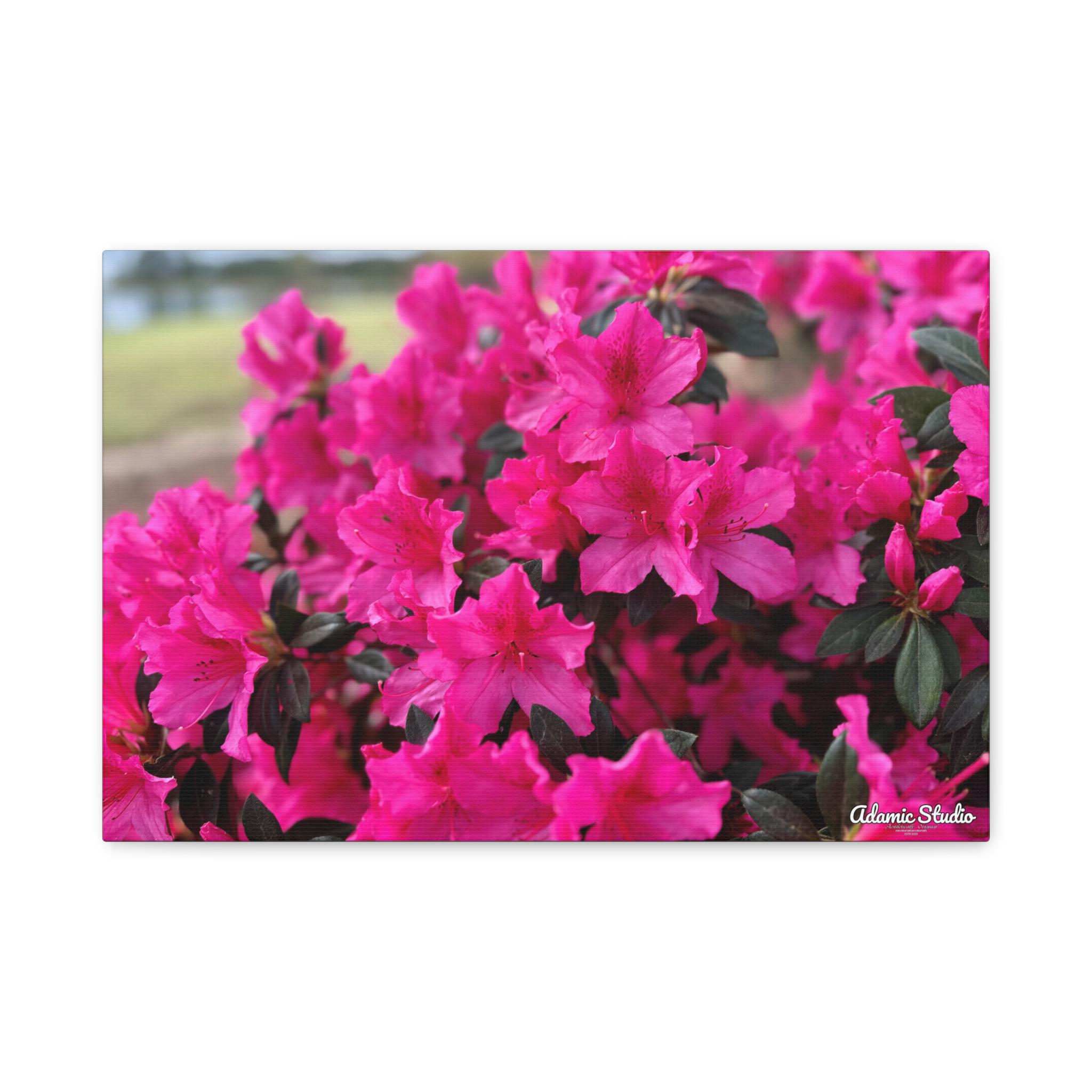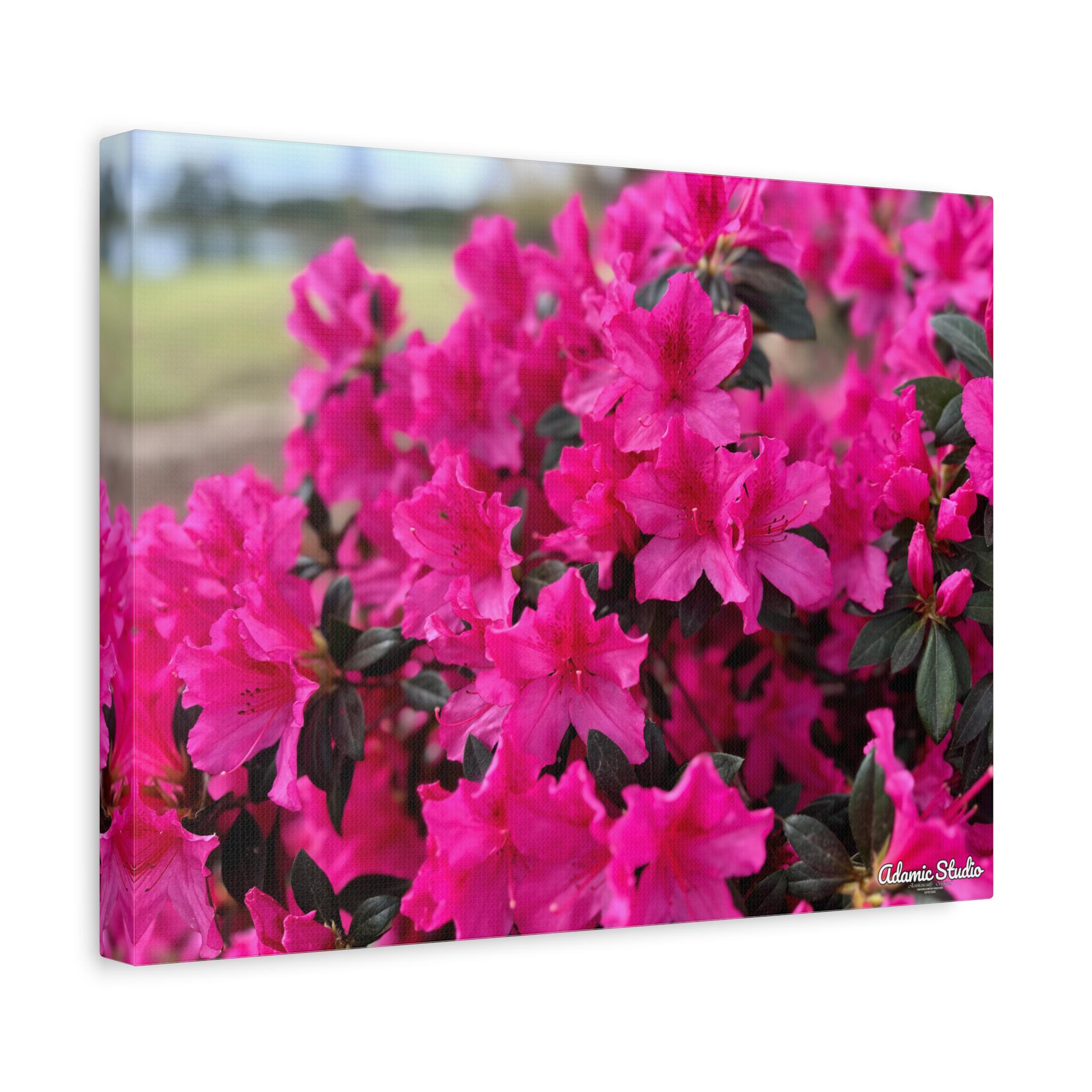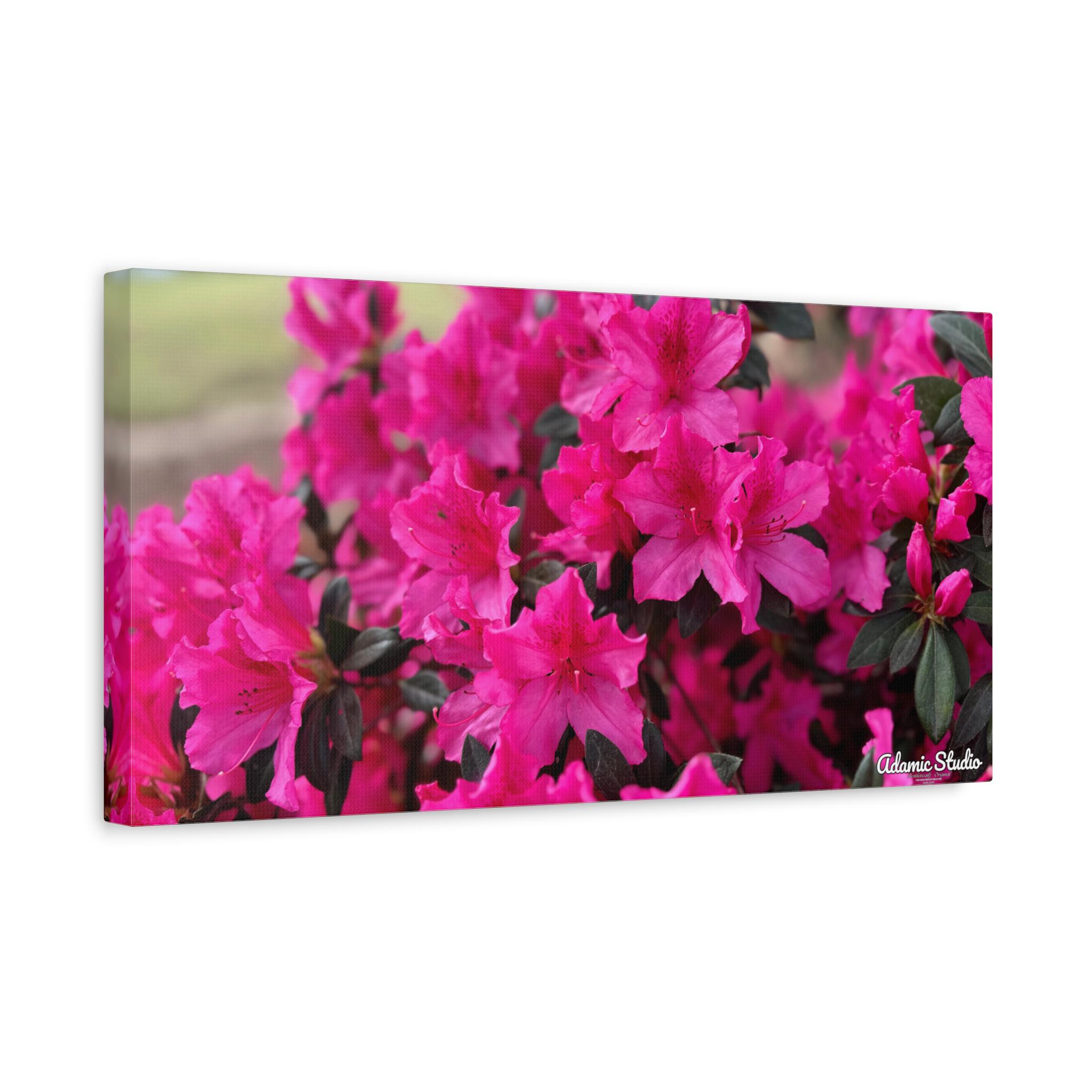 A vibrant matte canvas print that brings a burst of fuchsia azaleas into any room. The stretched 1.25" profile gives the image a clean, gallery-ready presence while the matte finish softens glare and enhances rich, natural tones. Printed with UL-certified Greenguard Gold latex inks on a durable cotton/poly canvas, the piece feels both refined and responsibly made. The lightweight radiata pine frame and discreet rubber feet keep the canvas steady and easy to hang—choose horizontal, vertical, or square orientations across multiple size options to suit your wall. This canvas creates a warm, blooming corner in living rooms, sunrooms, or cozy studios, capturing a moment of garden joy that settles into everyday life.