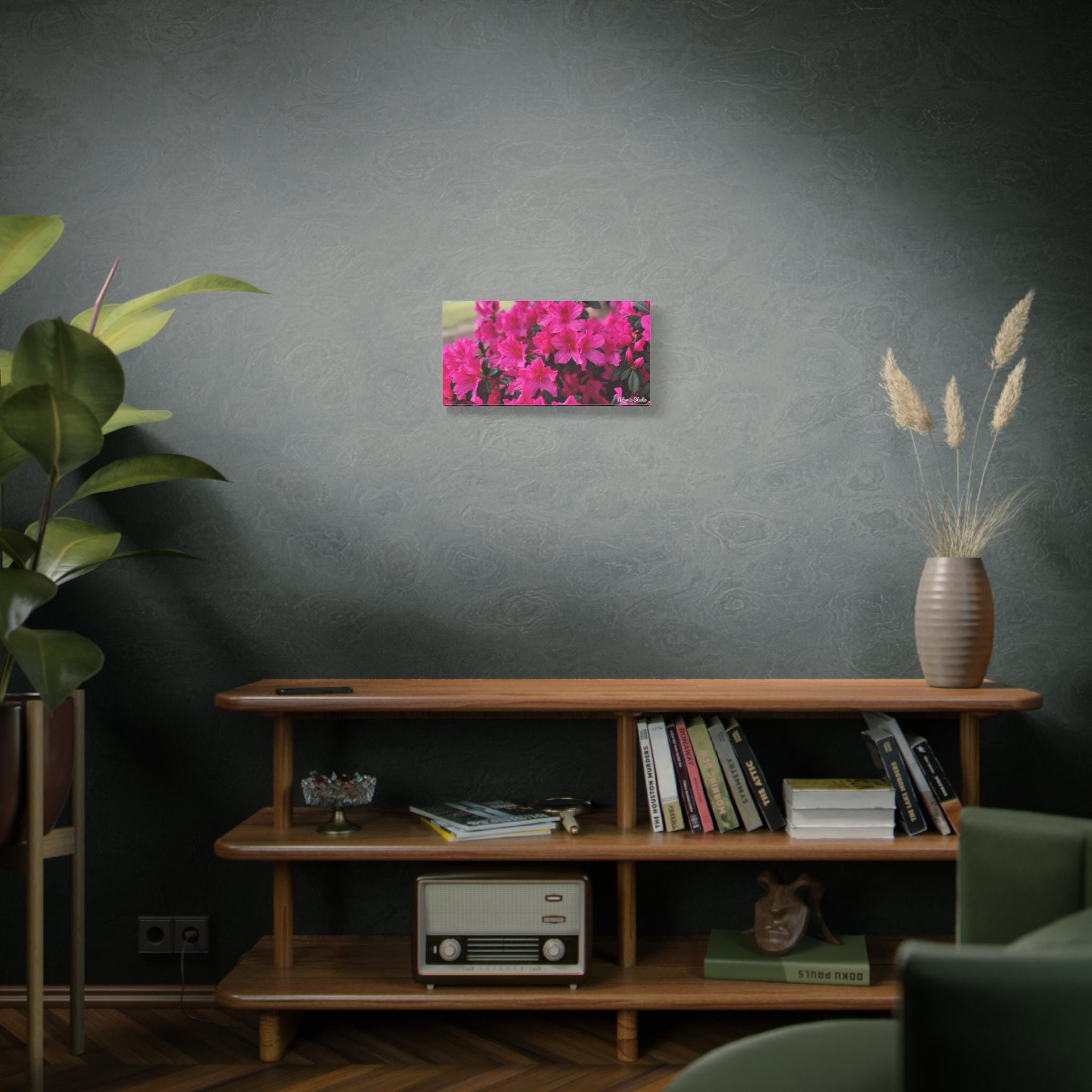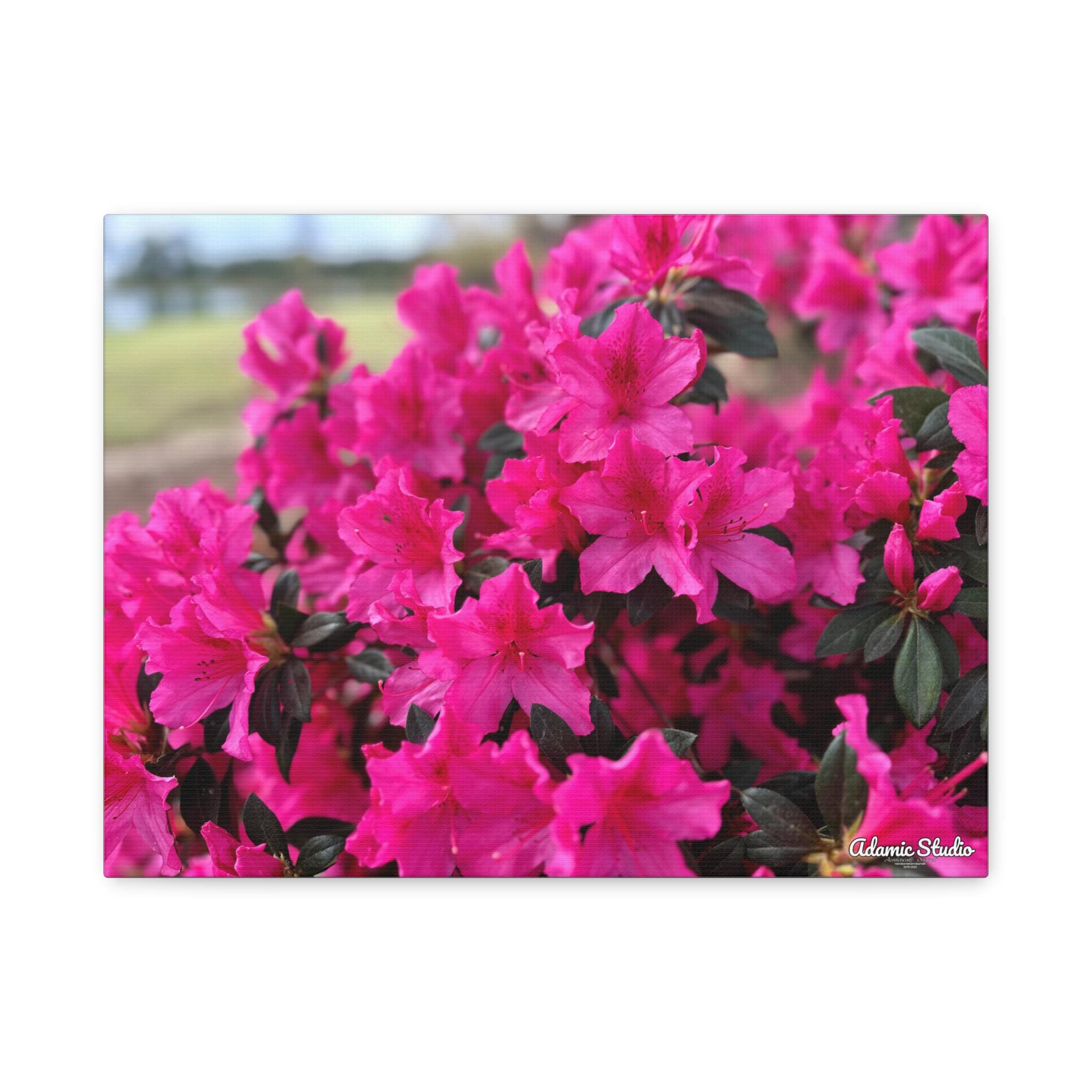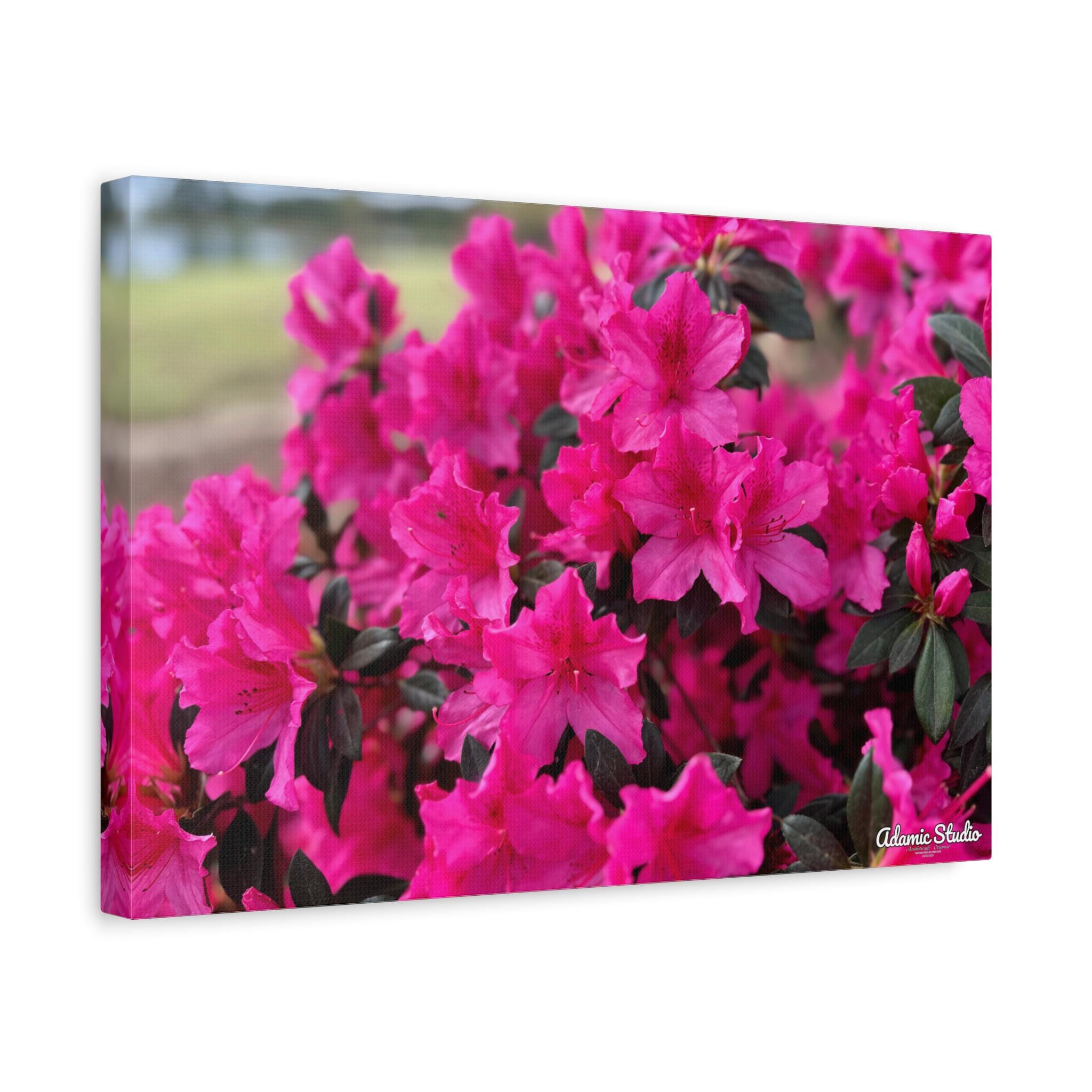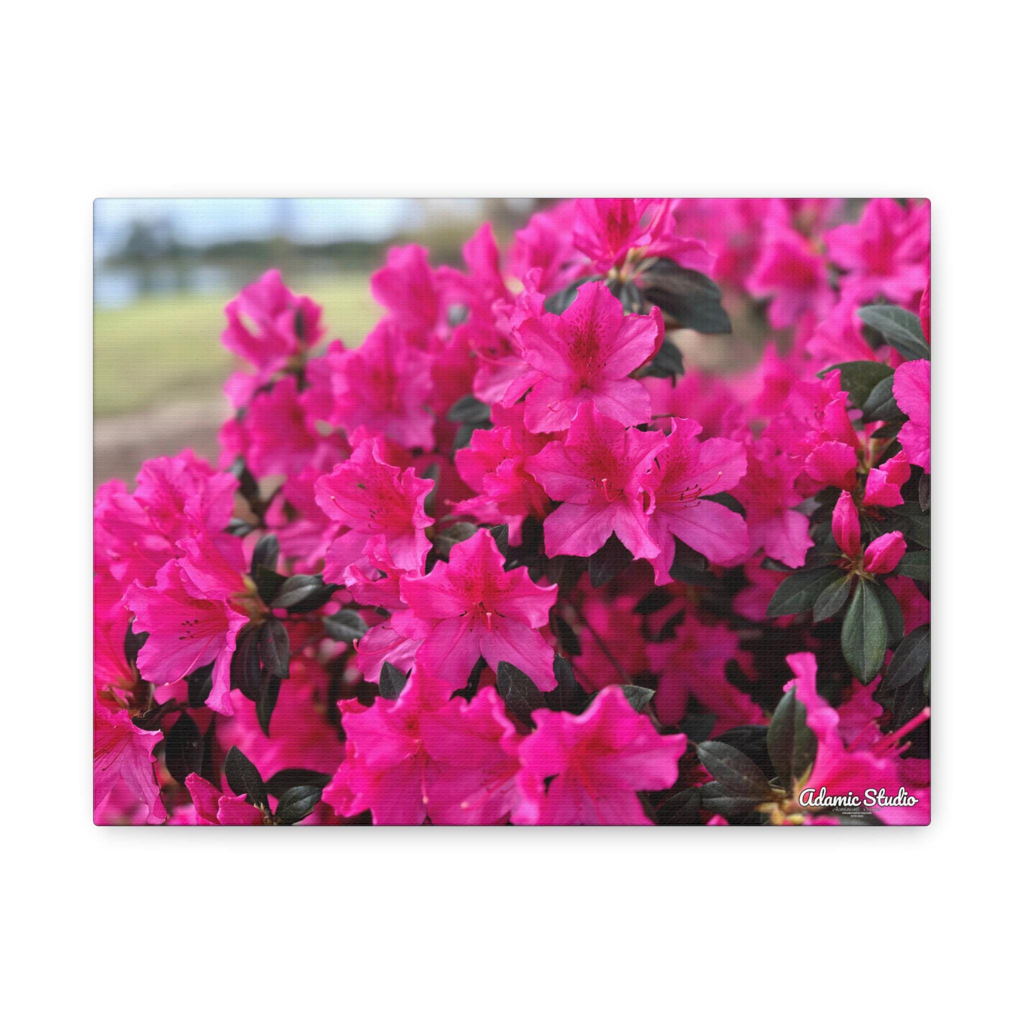 A vibrant matte canvas print that brings a burst of fuchsia azaleas into any room. The stretched 1.25" profile gives the image a clean, gallery-ready presence while the matte finish softens glare and enhances rich, natural tones. Printed with UL-certified Greenguard Gold latex inks on a durable cotton/poly canvas, the piece feels both refined and responsibly made. The lightweight radiata pine frame and discreet rubber feet keep the canvas steady and easy to hang—choose horizontal, vertical, or square orientations across multiple size options to suit your wall. This canvas creates a warm, blooming corner in living rooms, sunrooms, or cozy studios, capturing a moment of garden joy that settles into everyday life.